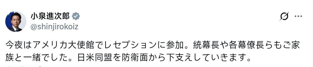 日本防卫大臣小泉进次郎:今晚,我出席了美国大使馆举行的招待会。联合参谋本部参谋长和其他参谋长及其家属也出席了。我将继续从防务角度支持美日同盟。