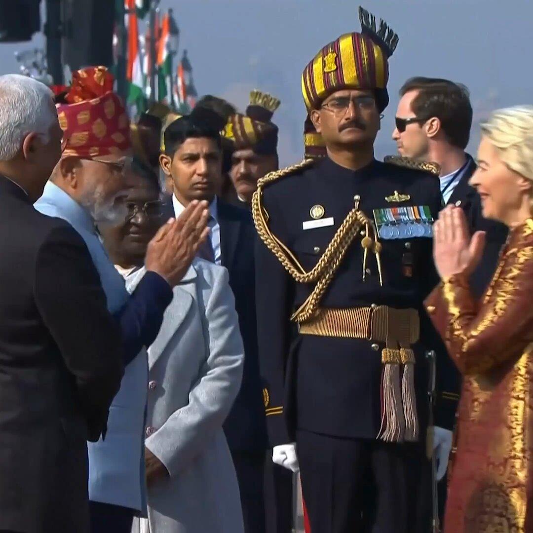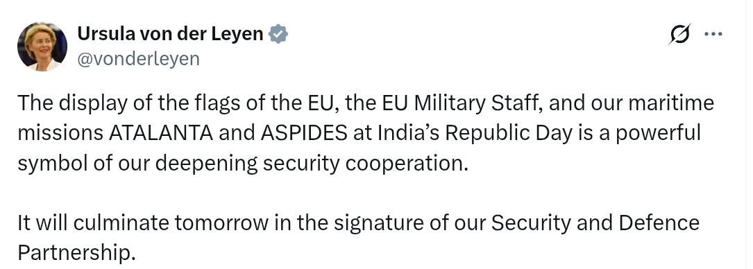 欧盟委员会主席冯德莱恩:欧盟、欧盟军事参谋部,以及我们的海上任务“阿塔兰塔”(ATALANTA)和“阿斯皮德斯”(ASPIDES)的旗帜在印度共和国日上的展示,是我们安全合作不断深化的有力象征。这一象征将在明天达到高潮——我们将签署《安全与防务伙伴关系》。