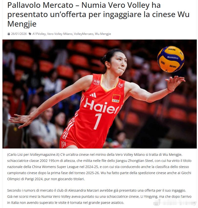 意甲米兰向中国球员吴梦洁提出报价外媒曝意甲米兰又瞄准了一位中国球员—吴梦洁。这位2002年出生的主攻手身高195,现效力于江苏中天钢铁女排。她随队赢得了2024-25赛季中国女排超级联赛冠军,并在2025-26赛季联赛第一阶段结束后领跑积分榜。吴梦洁曾入选2024年巴黎奥运会中国女排参赛阵容,但并非以主力身份出战。据转会市场传闻,亚历山德拉·马尔扎里执掌的米兰俱乐部已为其提交了报价。实际上,维罗排球早在数月前就曾尝试引进另一位中国主攻手李盈莹,但后者抵达意大利后因体检未通过而返回了中国。中国女排国际排坛动态