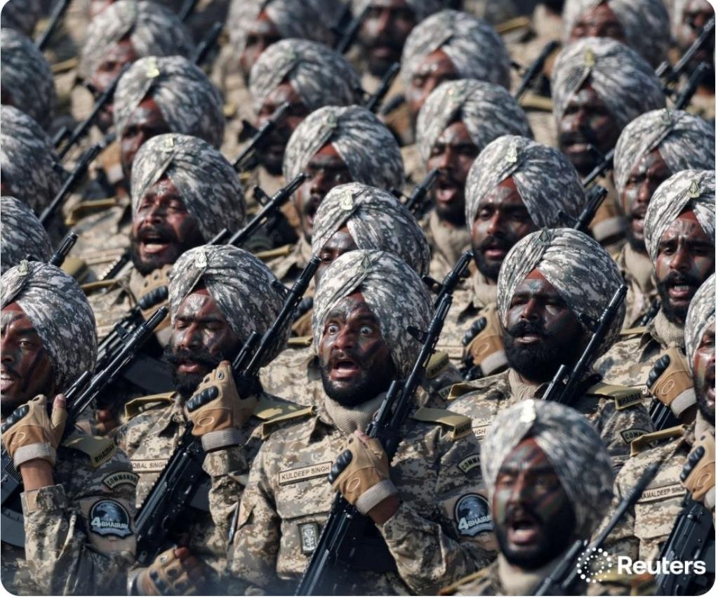 2026年1月26日,印度新德里举行共和国日阅兵式,士兵们列队行进。印度在新德里举行盛大阅兵式,庆祝其第76个共和国日,欧盟委员会主席乌尔苏拉·冯德莱恩和欧洲理事会主席安东尼奥·科斯塔作为主宾出席 来源:路透社