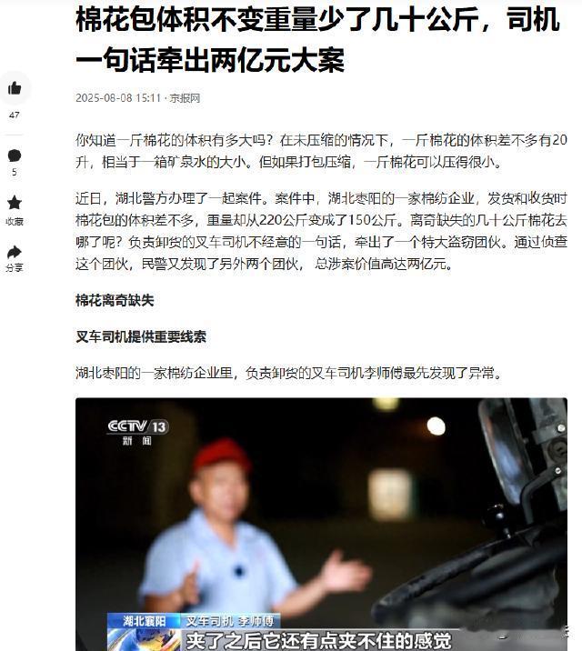 湖北枣阳,朱某本是跑长途的货车司机,运棉花时,发现纺织厂收货只数包不称重,觉得这是生财之道,他先偷棉花卖,尝到甜头后,在陕西咸阳租冷库当基地,拉10人入伙,还忽悠20多名货车司机当内鬼,又雇10多人拆包偷棉。一个多月里,他们在四省对8家企业下手,盗窃56车次,价值260多万。企业发现异常后报了警,46人全部落网,追回赃款73万。 据新京报报道,朱某跑长途运输好些年了,一直本本分分。2022年那次运棉花,他把货送到纺织厂,收货时,他注意到工作人员只是清点包数,根本不称重。 朱某觉得这是个赚钱的好机会。第一次偷棉花时,他很小心地从棉包里抽出一小部分棉花,藏在驾驶室里。 顺利把偷来的棉花卖出去后,朱某尝到了甜头。那笔钱来得太容易,比他辛苦跑长途赚得还多。他的贪欲开始膨胀,觉得这么好的机会不能错过。 到了2023年3月,朱某觉得一个人干效率太低,而且风险也大。他决定拉人入伙,扩大“生意”规模。他在陕西咸阳租了一个冷库,当作他们的“秘密基地”。 他先找到了10个平时关系不错、又比较缺钱的朋友,跟他们说有个赚钱的好路子,只要跟着他干,保证能赚大钱。这10个人一开始还有点犹豫,但看到朱某信誓旦旦的样子,又想到能轻松赚钱,就答应了下来。 接着,朱某又把目光投向了其他货车司机。他利用自己跑长途积累的人脉,忽悠了20多名货车司机当内鬼。 他跟这些司机说,只要在运输过程中帮他偷点棉花,就能分到一笔钱。这些司机有的贪图小利,有的觉得法不责众,就答应了朱某的要求。 为了更方便地偷棉花,朱某还雇了10多个专门拆包的人。这些人负责在冷库里把偷来的棉包拆开,取出棉花,然后再重新封装好,以免被人发现。 一切准备就绪后,朱某等人开始了疯狂的盗窃行动。他们在河南、湖北、湖南、陕西四省流窜作案,专门挑选那些收货只数包不称重的纺织厂下手。 每次运输棉花时,货车司机们都会按照朱某的指示,在途中偷一部分棉花出来,然后运到咸阳的冷库。拆包的人把棉花取出后,朱某再安排人把棉花卖出去。 一个多月的时间里,他们对8家企业疯狂下手,盗窃了56车次,涉案价值高达260多万。这些企业一开始并没有察觉到异常,因为每次收货时包数都对得上。 一些企业发现棉花的重量明显不对,他们开始仔细检查,发现很多棉包都被拆开过,里面的棉花被偷走了一部分。企业意识到问题的严重性,赶紧报了警。 民警通过调取监控录像、分析运输路线等方式,很快就锁定了朱某等人。经过一番周密的部署,警方一举将46名涉案人员全部抓获,追回了赃款73万。 对于这起案件,不同的人有不同的看法。 有人觉得朱某等人太贪婪了,为了钱不择手段。他们利用企业的管理漏洞,进行盗窃活动,不仅给企业造成了巨大的经济损失,也破坏了社会的经济秩序。这种行为应该受到严厉的惩罚,以儆效尤。 也有人认为企业自身也有责任。如果企业在收货时能够严格称重,加强管理,就不会给朱某等人可乘之机。企业应该从这起案件中吸取教训,完善管理制度,提高防范意识。 这46人为什么要这么做呢?他们难道不知道这是违法的吗? 从法律角度看,朱某等人的行为构成了盗窃罪。 根据刑法第二百六十四条的规定,盗窃公私财物,数额较大的,或者多次盗窃、入户盗窃、携带凶器盗窃、扒窃的,处三年以下有期徒刑、拘役或者管制,并处或者单处罚金。 数额巨大或者有其他严重情节的,处三年以上十年以下有期徒刑,并处罚金。数额特别巨大或者有其他特别严重情节的,处十年以上有期徒刑或者无期徒刑,并处罚金或者没收财产。 本案中,朱某等人盗窃的棉花价值260多万,属于数额特别巨大。他们一个多月盗窃56车次,属于多次盗窃。所以,他们的行为完全符合盗窃罪的构成要件。 朱某是整个团伙的主谋,他不仅发现了漏洞,还组织策划了整个盗窃活动,拉人入伙、安排作案、分配赃款,在犯罪中起到了主要作用。所以他是主犯,应当承担主要的刑事责任。 那20多名货车司机呢?他们只是按照朱某的要求运输棉花,并没有直接参与盗窃行为,为什么也被认定为犯罪呢? 这些货车司机虽然不是盗窃行为的直接实施者,但他们明知朱某的盗窃行为,还为其提供帮助,属于共同犯罪中的帮助犯。根据刑法规定,帮助犯也应当按照其所参与的共同犯罪处罚。 还有那10多名拆包的人,他们直接参与了盗窃行为,把棉花从棉包里拆出来,也是盗窃行为的重要组成部分。他们同样要为自己的行为承担刑事责任。 最终,2024年底到2025年11月,法院作出判决,46人因盗窃罪获刑。朱某等11名主犯被判处10年10个月到1年3个月不等的有期徒刑,并处罚金;24名司机从犯被判处缓刑,并处罚金,刑期从1年5个月到拘役6个月不等;11名“改包工”被判处3年到2年有期徒刑,适用缓刑,并处罚金。 对此,大家都怎么看呢,来讨论一下吧!