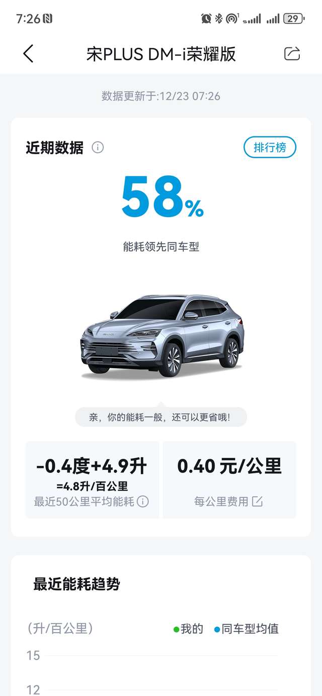 宋plus荣耀版混动跑了39公里 用油续航掉了42公里,百公里4.8个油,能耗还行。室外温度3-4度,走国道的,空调温度25度