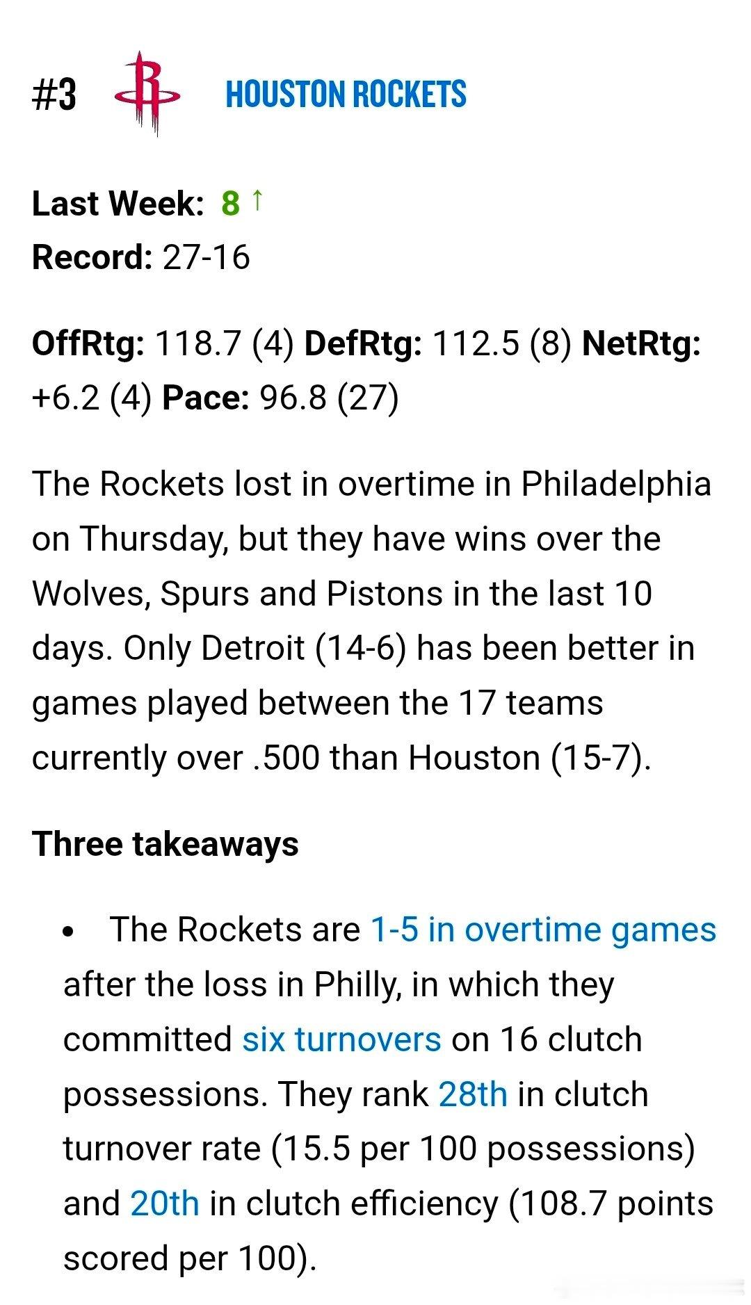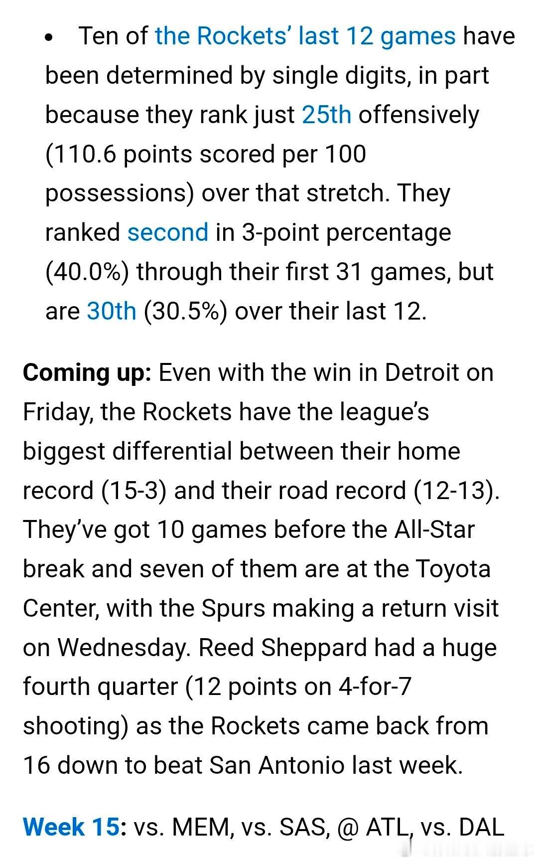 火箭队近期被NBA官方实力榜从第8位大幅提升至第3位。▪️第3位:休斯顿火箭队上周排名:8(↑上升)战绩:27胜16负进攻效率:118.7(联盟第4) 防守效率:112.5(联盟第8) 净效率:+6.2(联盟第4) 比赛节奏:96.8(联盟第27)火箭队周四在费城经历了加时失利,但在过去10天里,他们先后战胜了森林狼、马刺和活塞。在所有目前胜率超过五成的17支球队中,只有底特律活塞(14胜6负)在对阵这些强队时的战绩优于休斯顿火箭(15胜7负)。· 在费城失利后,火箭队在加时赛中的战绩变为1胜5负。在那场比赛中,他们在16个关键回合中出现了6次失误。火箭队的关键时刻失误率高居联盟第28(每百回合15.5次),关键时刻进攻效率则排在第20位(每百回合得108.7分)。🔻火箭队过去12场比赛中有10场分差在个位数,部分原因在于他们在此期间进攻效率仅排联盟第25(每百回合得110.6分)。在赛季前31场,他们的三分命中率高居联盟第二(40.0%),但过去12场却跌至垫底的第30位(30.5%)。未来赛程: 尽管周五在底特律取胜,火箭队仍是联盟主客场战绩差异最大的球队(主场15胜3负,客场12胜13负)。在全明星周末前他们还有10场比赛,其中7场将在丰田中心进行,周三马刺队将再次到访。在上周逆转16分战胜马刺的比赛中,里德·谢泼德在第四节发挥神勇(7投4中,得到12分)。第15周赛程: 主场对阵孟菲斯灰熊,主场对阵圣安东尼奥马刺,客场对阵亚特兰大老鹰,主场对阵达拉斯独行侠。🔻 尽管火箭队在最后5分钟分差5分以内的“关键时刻”比赛中战绩仅为10胜13负,但在那些最后5分钟分差不是5分以内的比赛中,他们的战绩是17胜3负。周五他们让底特律活塞队尝到了第三场非关键时刻的失利,尽管他们是在费城加时失利后不到24小时就投入了这场比赛。赛季初在没有休息优势的情况下,火箭队前三场全败,但在一月份背靠背的第二场比赛中取得了2胜0负,其中包括战胜森林狼和活塞队的“休息劣势”胜利。周五他们仅使用了八人轮换,虽然在费城的失利中凯文·杜兰特出现了8次失误,但他在背靠背两场总计近85分钟的出场时间里,40投24中,命中率达到60%。休斯顿火箭灰熊vs火箭休斯顿火箭
