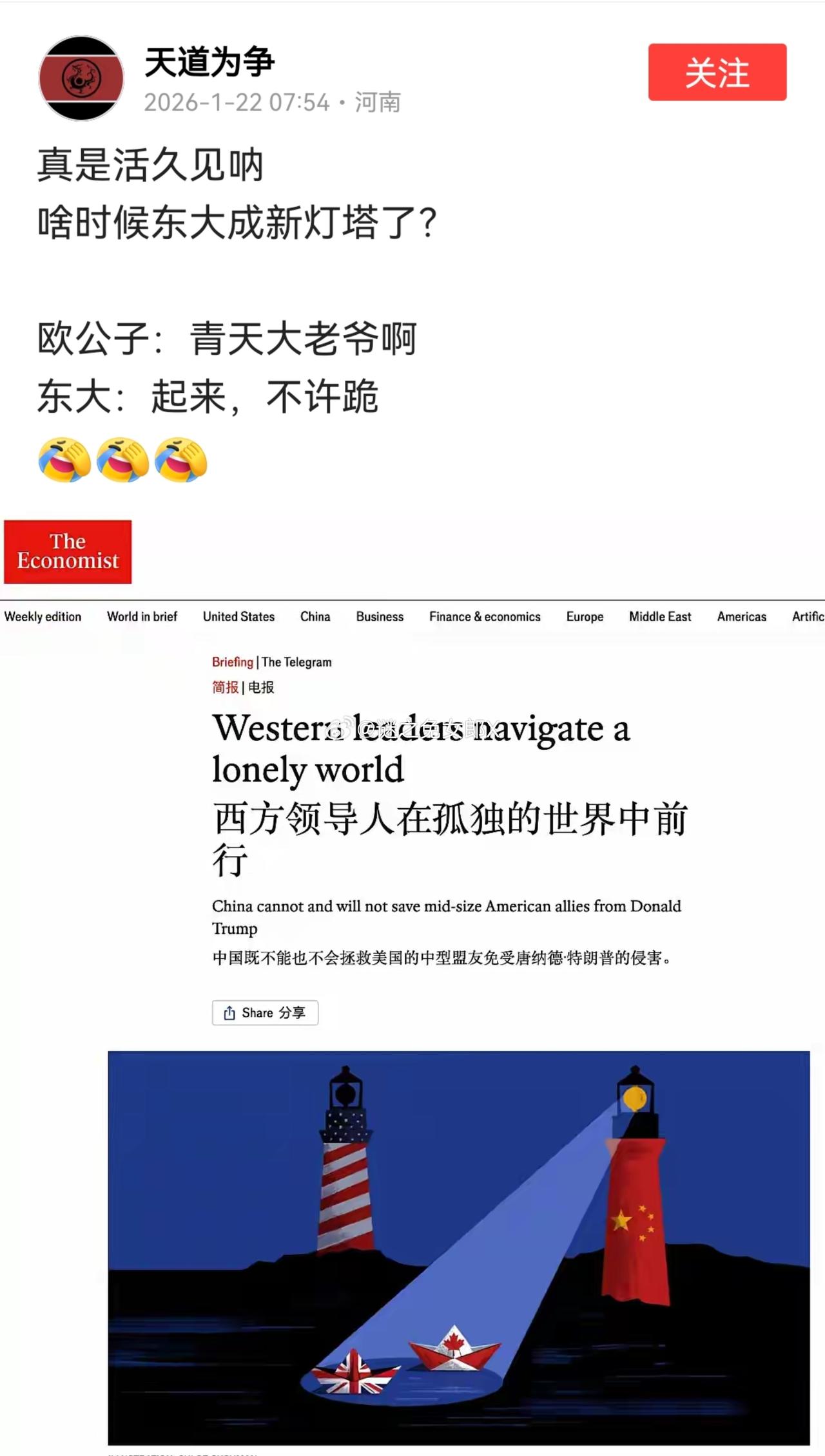 好家伙,啥时候东大成新灯塔了?   西方人的思维模式就是这样,发现你有苗头的时候先制裁你,后来发现没用的时候开始谈条件,努力形成相互制衡,并且尽可能把他们的行动自由程度放到最大。   美国已经悟了,只要不跟中国硬斗,然后老子就是无敌的。   就让他们狗咬狗,咱们旁观就好。