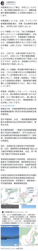 日本防卫大臣小泉进次郎今晚(1月26日晚)写道:“即使在今年,中国和俄罗斯军队也积极利用情报搜集舰船和飞机在日本周边海域和空域开展活动。 就拿本月来说,中俄两军的相关行动都有明确的背景和依据。1月18日,两架俄军伊尔-38反潜巡逻机就曾飞越日本海,经对马海峡抵达东海上空后折返,日本防卫省统合幕僚监部随即宣称紧急出动战机应对。 这款反潜机是俄罗斯岸基航空反潜的主力装备,续航时间可达10小时,此次飞行完全是俄军常态化战备巡逻的一部分,全程遵循国际空域使用规则,不存在任何越界或挑衅行为。 同一时间段,中俄海军舰艇也曾有过联合行动。日本防卫省此前发布消息称,5艘俄罗斯海军舰艇和6艘中国军舰曾首次通过冲绳本岛和宫古岛之间的宫古海峡北上,开展联合训练。 中国国防部新闻发言人吴谦早已明确回应,此次行动是中俄两军年度合作计划内的安排,不针对第三方,与当前国际和地区局势无关,且中俄双方舰艇全程在公海航行,严格遵守国际法相关规定。 小泉进次郎刻意强调“情报搜集”,却对日本自身的侦察行为避而不谈。事实上,日本自卫队长期以来一直在东海、日本海等区域频繁开展侦察活动,甚至多次闯入中俄联合演习区域进行干扰。 此前中俄在东海举行联合演习时,日本就曾出动OP-3C合成孔径雷达侦察机和YS-11EB电子测定机,抵近演习区域收集中俄舰艇的雷达信号和电子数据,中方当时出动苏-27战机采取必要识别防范措施,维护演习安全。 日本一边大肆开展情报侦察,一边对中俄的常规巡逻指手画脚,这种双重标准的做法,本质上是为其强化西南诸岛防卫、部署远程导弹寻找借口。 小泉进次郎此前就曾公开表态,称要加速部署远程导弹,强化西南诸岛防卫姿态,还妄称台海冲突关乎日本安全,要讨论行使集体自卫权的可能,这番言论早已暴露日本推动军事扩张的野心。 俄罗斯方面近期在南千岛群岛周边的军事活动,同样让日本反应强烈。俄军从2026年1月1日起,在南千岛群岛周边海域开展为期两个月的实弹射击训练,这片区域正是日本一直觊觎的“北方四岛”附近。 2025年俄军就已在该区域发布9次军演通告,平均每月一次,甚至曾暂停日本等国船只的无害通过权,俄罗斯外长拉夫罗夫还点名批评日本领导层加速军事化,对地区稳定造成负面影响。 中俄两军的互动并非针对日本,而是基于两国战略合作的正常军事协作。2025年8月中俄海上联合演习后,舰艇编队曾穿越津轻海峡,12月空中巡航中,中国轰-6K与俄罗斯图-95战机会合后穿越琉球空域,这些行动都形成了对地区不稳定势力的有效震慑。 日本自卫队对中俄舰机的活动总是过度反应,动辄出动舰机跟踪监视、发布相关消息,本质上是在制造地区紧张氛围,为其突破和平宪法、扩充军事力量造势。 要知道,日本周边海域和空域大多是国际公海和公共空域,各国都享有正常航行和飞行的权利,中俄军队的活动完全符合国际惯例,反倒是日本近年来不断强化军事部署,在西南诸岛修建军事设施、部署导弹阵地,才是真正破坏地区和平稳定的行为。 小泉进次郎的这番言论,不过是日本渲染“外部威胁”的老套路。日本总想通过夸大周边军事动态,蒙蔽国内民众,换取对军事扩张的支持,这种做法终究难以得逞。 国际社会都清楚,中俄始终是维护地区和平稳定的重要力量,两军的常规行动不会对任何国家构成威胁,反而能遏制部分国家的扩张野心。 日本与其指责他人,不如反思自身行为,停止炒作地区紧张局势,放弃军事扩张的危险想法,否则只会加剧地区对立,最终损害自身利益。 毕竟在当前国际形势下,靠渲染威胁、扩充军力换不来安全,只有秉持平等互利、和平共处的原则,才能真正维护地区的和平与稳定,这是任何国家都不该忽视的基本道理。