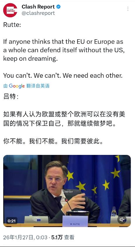北约秘书长吕特今天(北京时间1月27日)表示:“如果有人认为欧盟或整个欧洲可以在没有美国的情况下保卫自己,那就继续做梦吧。你不能。我们不能。我们需要彼此。”   这事儿要是往深了扒,其实一点也不奇怪,毕竟欧洲这几十年可是真的过惯了舒服日子。自从冷战结束以后,北约这帮人就把国防这一块给彻底松懈下来了,军费那是常年维持在低水平,各国政府更愿意把钱花在福利和高工资上,谁也不想掏大价钱去造坦克买导弹。   吕特这时候跳出来说这话,其实心里比谁都虚,他清楚得很,现在欧洲的库存早就被掏空得差不多了,要是明天真打起仗来,没有美国的指挥体系和后勤补给,欧洲那些所谓的精锐部队连几天都撑不住。   咱们都知道,特朗普那会儿当总统的时候,就天天嚷嚷着让欧洲交保护费,说你们占美国便宜太久了。   当时默克尔还在的时候,欧洲人还硬气了一把,说要搞自己的防务体系,要搞“欧洲军”,听起来是挺像那么回事。   可实际上呢?这么多年过去了,不仅“欧洲军”没影儿,连原来的国防缺口越来越大。   吕特现在接了这个烂摊子,眼看着乌克兰那边还在耗着,欧洲的弹药库都快见底了,他要是再不把美国这尊大佛请回来,真要是出了事,他这北约秘书长的位子根本坐不稳。   这话说出来,其实也是打了不少欧洲激进派的脸。前阵子法国那位总统不是还嚷嚷着要派兵去乌克兰吗?德国那边也跟着起哄,说要欧洲做主。   结果呢?真到了要出钱出力的时候,一个个都缩了脖子。吕特这一句“继续做梦吧”,虽然听着刺耳,但却是大实话。   欧洲现在的工业制造能力,跟美国和中国比起来,早就不是在一个量级上了,造个炮弹都得去韩国求援,要是没了美国的空天优势和核保护伞,欧洲就像是个没穿衣服的巨婴,站在寒风里瑟瑟发抖。   而且吕特这时候放这个话,也是给美国那边的一个投名状。现在美国政坛那是乱成一锅粥,谁上台都不好说,吕特是生怕美国哪天真的抽身走了,把欧洲扔在半道上。   他这么把姿态放得这么低,甚至有点摇尾乞怜的意思,就是想稳住美国人心,让美国觉得欧洲还是离不开他的,还得继续在这欧洲驻军,还得继续当这个“带头大哥”。   毕竟,北约这个机构要是没了美国,那就是个没牙的老虎,连纸老虎都算不上。   对于咱们看客来说,这事儿看得是一清二楚。欧洲这几十年的“和平红利”其实是透支了未来的安全感换来的,现在到了还账的时候了,他们才发现自己手里没牌。   吕特这番话,与其说是说给欧洲老百姓听的,不如说是说给美国国会那帮人听的,是在求美国别抛弃他。这种把身家性命都挂在别人裤腰带上的做法,早晚会让他们吃大亏,到时候就算想醒梦,估计也没那么容易了。