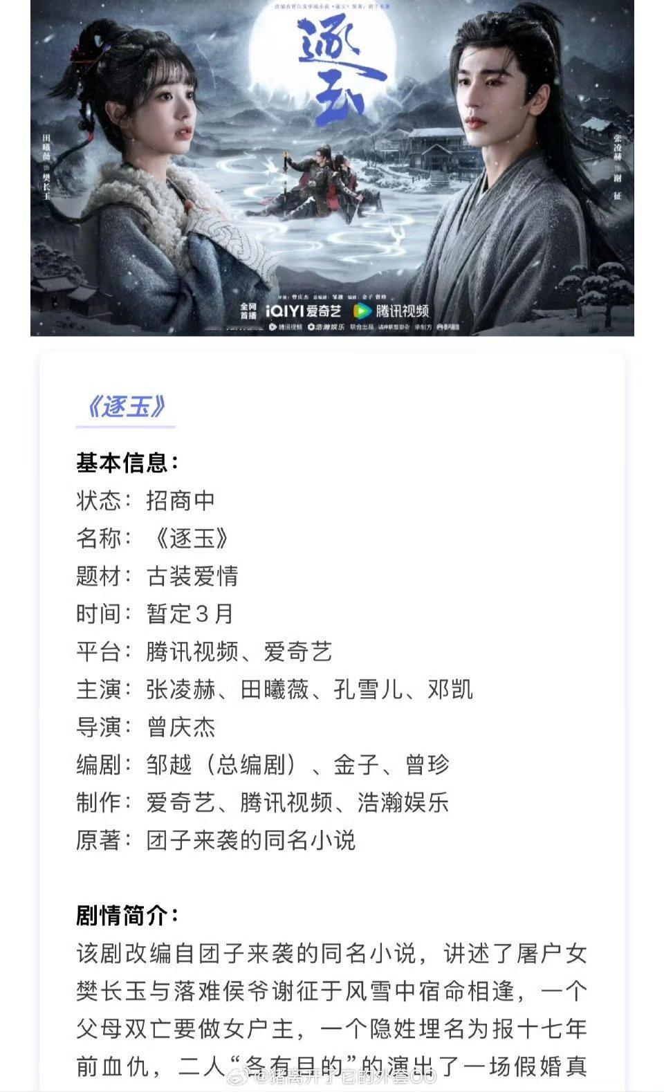 张凌赫、田曦薇的《逐玉》播前招商,预计3月6日爱奇艺、腾讯视频开播,开始录制好六啦