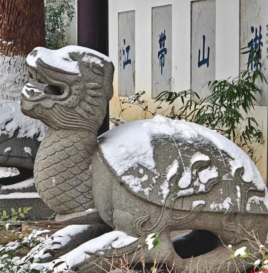 雪给石龟披了层素衣,古碑的蓝字在墙间静立,岁月在寒枝与雕纹里,酿成了清冽的诗。 🐢 石龟驮着积雪,像驮着一整个冬的寂静,身后的墨字与青竹,把时光晕成了水墨长卷。 🌨️ 雪粒栖在龟甲的纹路里,古碑的字迹浸着寒意,老石与新雪对望,连风都带上了千年的温凉。