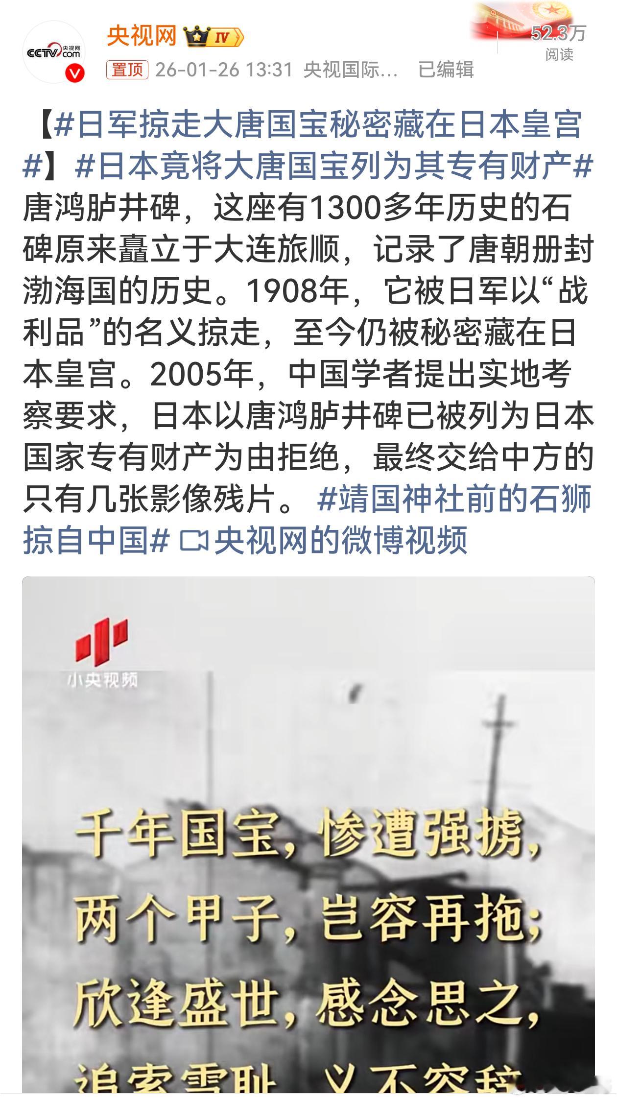 日本竟将大唐国宝列为其专有财产日军掠走唐鸿胪井碑,将千年大唐国宝“据为己有”,这是对中国历史文化的野蛮侵犯与掠夺。文化瑰宝应回归故土,此碑的遭际,提醒我们铭记历史,不懈索回。