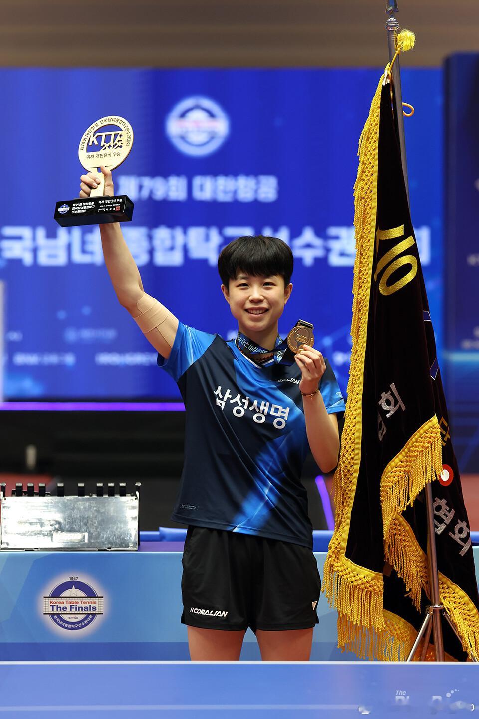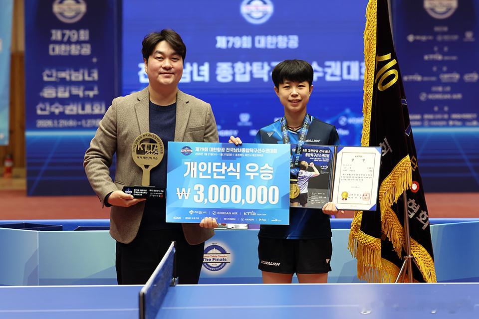 朱芊曦,荣膺全国乒乓球综合锦标赛冠军!能拿的冠军全都拿了!朱芊曦(24岁,三星生命)夺得了第79届大韩航空全国男女综合乒乓球锦标赛女子单打冠军。在27日上午进行的决赛中,朱芊曦以3比0(11-5、11-8、11-3)完胜大韩航空队的“可怕的10代新星”朴佳贤(17岁)。这是一场从开局就占据主动的完胜。朱芊曦频频打出强有力的制胜球,正反手精准的击球落点几乎无懈可击。本届比赛中,她仅在32强赛对阵防守型选手金敏瑞(青阳郡乒乓球协会)时丢掉一局,其余所有比赛(包括决赛)全部以3比0获胜,展现出压倒性的统治力。在“归化王牌”对决的半决赛中,她同样以3比0(11-6、11-5、11-8)战胜崔孝珠(大韩航空),最终用冠军为本届赛事画上句号。朱芊曦出生于中国山东省潍坊市,2019年加入三星生命队,并于2020年1月取得韩国国籍。她自2023年起正式活跃于韩国国内赛场,出道当年便获得KTTL职业联赛MVP,给人留下强烈印象。此后,她接连夺得实业联盟会长杯、全国运动会、总统杯等重要赛事冠军,确立了国内最强者的地位。2025年夺得分类别锦标赛冠军后,又在本届最高权威赛事中登顶,至此几乎包揽了在韩国国内能够获得的所有冠军。本届比赛中,她还与队友金成珍搭档夺得女子双打冠军,实现个人赛“双冠王”。朱芊曦在夺冠后表示:“能夺冠真的很开心,也为此做了充分准备。这要感谢蔡允锡教练、李尚洙教练、尹周贤教练,以及一直努力拼搏的队友们,也真心感谢一直支持我的三星生命公司。我会继续更加努力,成为更好的选手。”截至2026年1月,朱芊曦的世界排名已升至第16位,作为韩国女子乒乓球队的攻击型主力,她备受期待。随着归化年限的完成,她将从今年的名古屋—爱知亚运会开始以国家队选手身份参赛,有望填补田志希、徐孝元退役后留下的实力空缺。夺得本届最高权威赛事冠军,也为她的2026年开了个好头。她表示:“首先,成为亚运会国家队成员最重要,我会努力争取奖牌。今年的目标是进入世界排名前10。”亚军得主朴佳贤在本届比赛中同样表现亮眼。在此前的半决赛中,她以3比1(11-9、4-11、12-10、11-8)战胜梁夏银(31岁,华城市公社)。而梁夏银正是去年全国综合大赛半决赛中击败朴佳贤的对手。连续两届闯入四强的未来王牌朴佳贤,这一次跨越了曾阻挡自己的前辈,迈上更高一级的舞台。她也面带笑容出席了颁奖仪式,同样迎来了充满活力的2026年开局。目前,在忠北堤川体育馆举行的第79届大韩航空全国男女综合乒乓球锦标赛仅剩男子团体决赛。男子团体赛中,韩国交易所队与世亚队这两支新兴强队正在展开激烈对决。(《月刊乒乓球》/The PingPong 机翻)