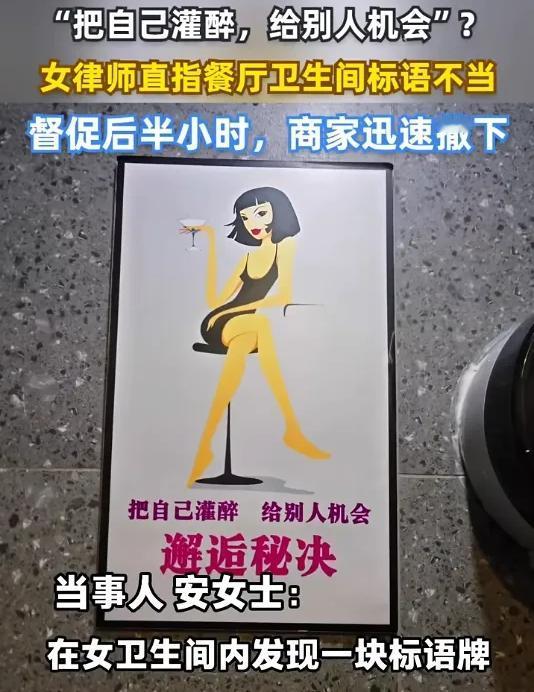 河北一女子在餐厅女卫生间发现“把自己灌醉,给别人机会”标语牌,反映后老板不仅完全接受了她的意见,还特地拍了一段视频发过来,让女子验收。 1月25日那天,安女士像往常一样,去了那家自己常光顾的餐厅吃饭。 中途去卫生间的时候,一抬头,就看到墙上挂着一块小牌子,上面赫然写着一句话:“把自己灌醉,给别人机会”。安女士当时心里就感觉特别不舒服。 她觉得这话的导向很不对劲,乍一听像是句“玩笑话”,但细品之下,隐隐有种鼓励过度饮酒、甚至为不当行为开脱的味道。 尤其餐厅这种地方,来来往往的客人里说不定还有未成年人,让孩子们看到这种标语,会产生什么影响? 安女士越想越觉得这事不能就这么算了。 她当即就通过微信联系了这家店的老板,直接告诉他,认为这块牌子的“思想太恶臭”,这种言辞简直是在“纵容犯罪”,并要求对方立刻把牌子撤下来。 发完消息,安女士心里也没底,不知道老板会怎么回应。是置之不理,还是觉得她多管闲事? 没想到,大约才过了半个小时,老板的回复就来了。老板不仅完全接受了她的意见,行动更是迅速——那块引发争议的标语牌已经被取下。 更难得的是,老板还特地拍了一段视频发过来,给安女士“验收”整改结果。从发现问题到解决问题,整个过程干脆利落。 事后,安女士把这段经历分享到了网上。她写下了这么一句话:“社会的进步往往是较真的人在推动。” 在她看来,这种有害无益的标语,就不该出现在公共场合,哪怕有人觉得这是“小题大做”,她也坚信,每一次“不服输、不能忍”的认真纠正,都能让我们周围的环境变好那么一点点。 这件事被发到网上后,引来了不少网友讨论。 很多网友为安女士和老板点赞:“这位女士三观正,老板能听劝也是好样的!”“公共场合的标语确实需要注意影响,这真不是小事。” 也有人提出了更深的问题:“这种低俗标语当初是怎么被挂上去的?商家做宣传时是不是该多过过脑子?” 还有网友分享类似经历:“确实,很多小店喜欢用这种‘抖机灵’的标语吸引眼球,是该管管了。” 一条标语,一次沟通,一场迅速的改变。事不大,却很暖人心。 公共空间里的每一处细节,其实都在无形中塑造着我们的氛围。 今天能随手撤下一块不合适的标语,明天或许就能避免一个更糟糕的玩笑。改变,往往就从一次不沉默的开始。 你在外就餐时,有遇到过类似让你觉得不舒服的标语或广告吗?如果是你,会选择说出来吗?