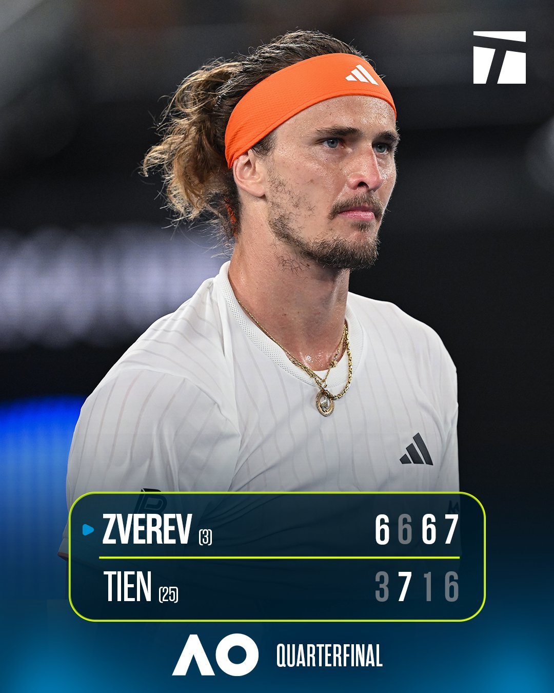 其实那天梅总这个笑容的意思是:“蛤?这个勒纳·钱,他现在就连发球也这么能发了吗?”今天看球时正好看到一个蛮有意思的数据就随手拍了图,大家看,一年不见,小钱钱的发球真的有明显变猛。除了球速的提升之外,去年澳网,五盘战中他的一发时速是逐盘下降的;本次澳网的五盘战中,他的一发时速却能基本保持稳定。这真的是很大的进步幅度。发球简直就是勒纳·钱打法体系中唯一的明显弱点,如果发球还能补强,他将变得更加难以战胜。但话又说回来,发球再补强,那也强不过兹维列夫。兹维列夫刚刚现场采访还说呢:“今天要不是我发了20多个Ace,我可能都赢不下来;他在底线打得太惊人了,我很久没碰到底线这么强的对手。”紫薇赛后发言水准一直是业界顶流,可能是有一点夸张和夸赞后辈的因素啦,不过肯定也道出了事实。恭喜兹维列夫打入了人生第10个大满贯4强,你们看,不声不响地,他又进四强了。因为从未拿过大满贯冠军,兹维列夫很容易成为群嘲的对象,他本届澳网2026 也不是那么被看好,但他终究稳稳把自己送进了四强,还是应该得到很多肯定。他虽然是ATP排名榜上那个和阿卡辛纳积分断崖式巨幅差距的世界第3,但他还是世界第3啊!阿卡辛纳固然厉害,但世界第3,也只有一个。兹维列夫连续三年晋级澳网四强 丨 兹维列夫3比1勒纳钱