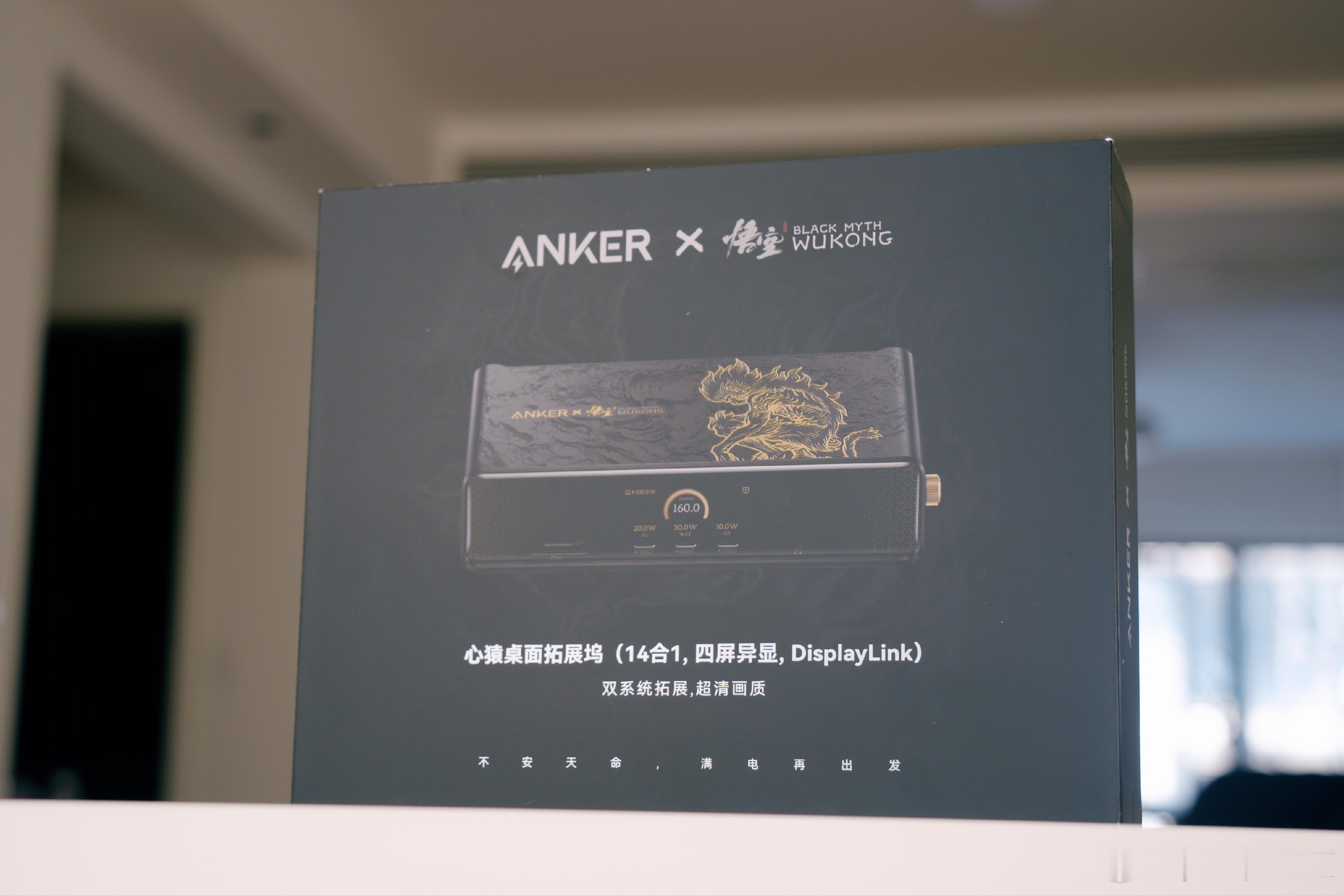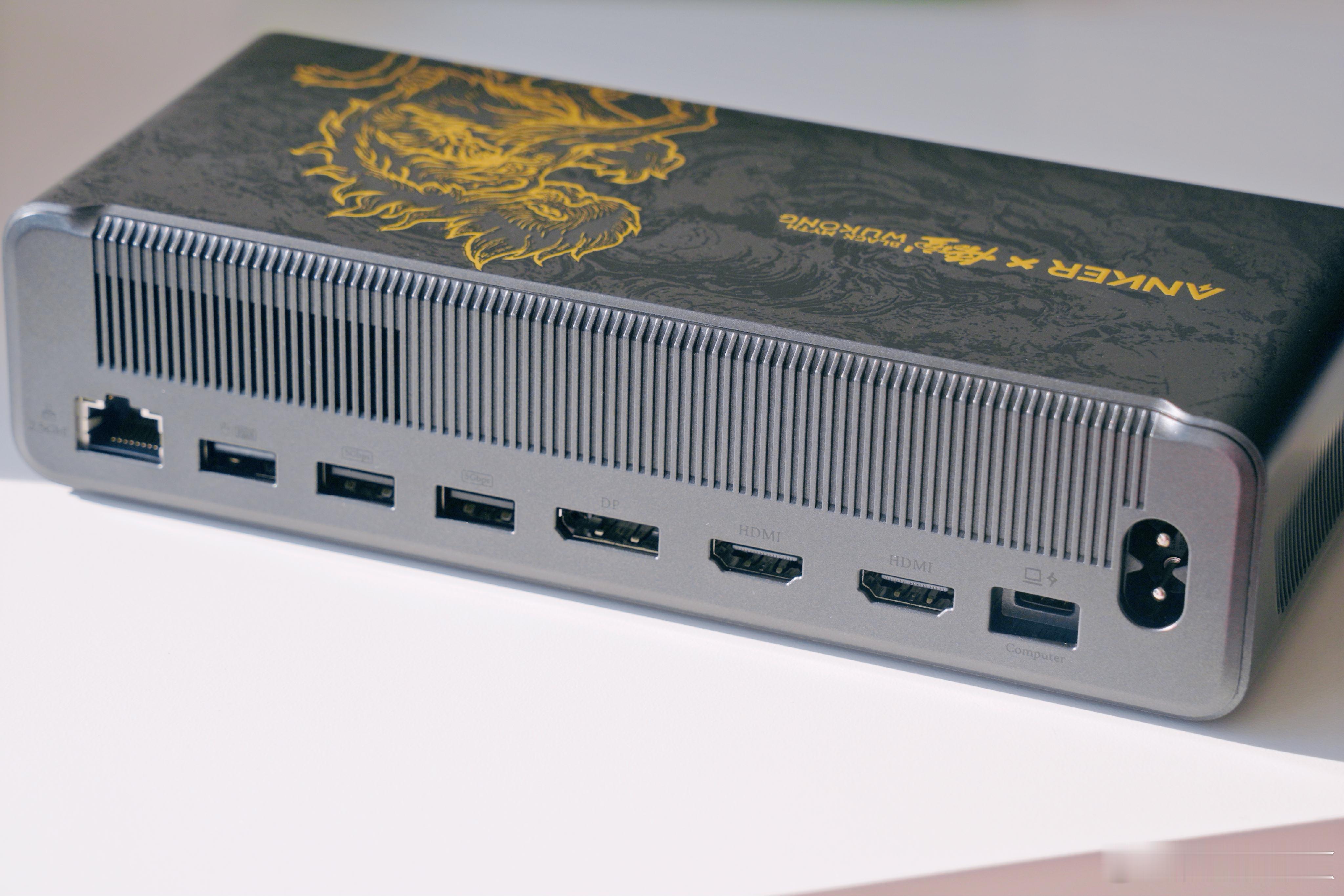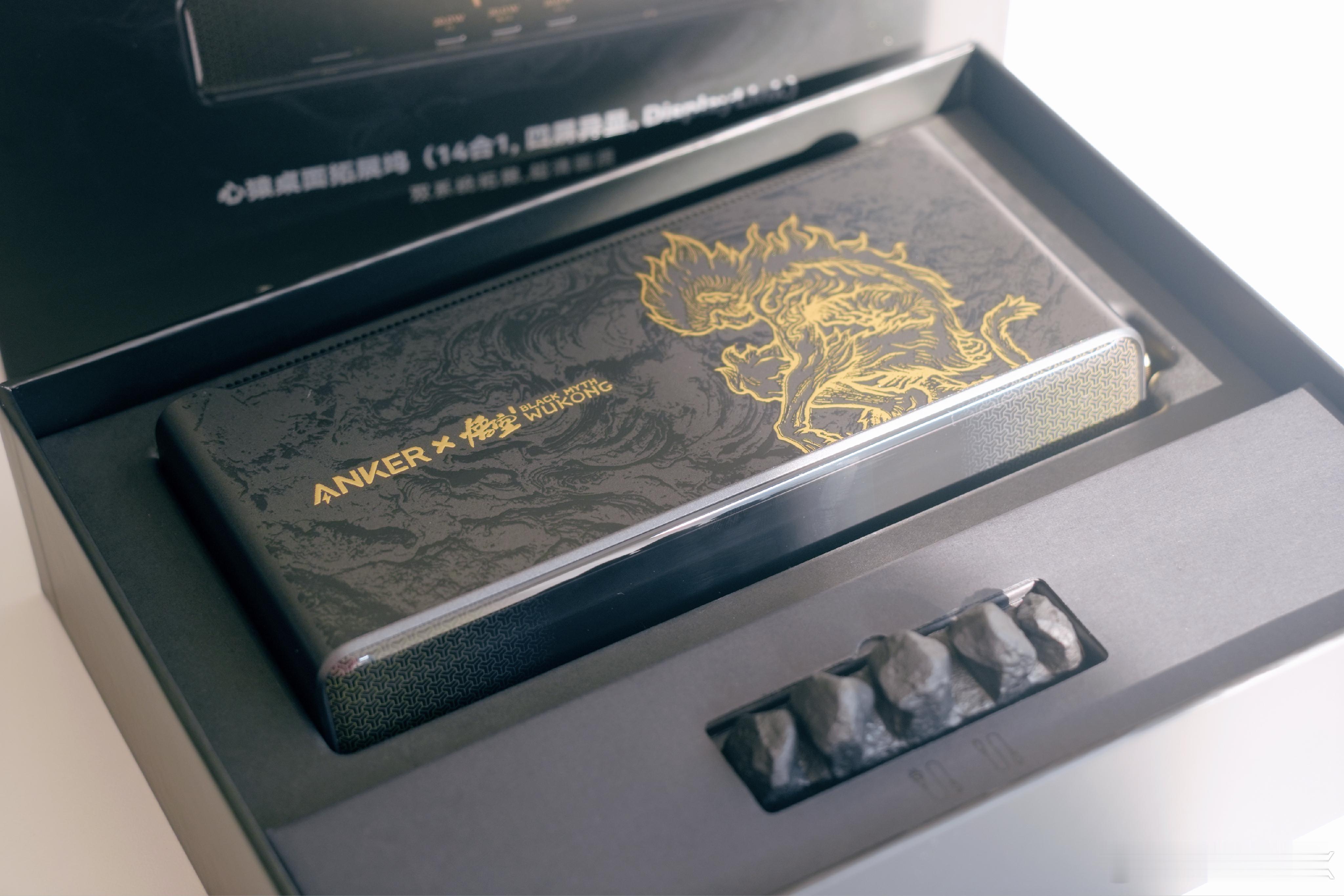 一直想找个能搞定多设备连接的桌面拓展坞,偶然入手了安克和《黑神话:悟空》的联名款“心猿”,用了一周发现不仅实用性拉满,联名细节也完全长在审美上,不是那种敷衍的换皮设计,值得好好跟大家说说。最打动我的是它的14合1全接口配置,对于经常要接笔记本、硬盘、相机还有外接屏幕的人来说,简直是“理线救星”。前面3个USB-C口既能100W快充,传输速度也能到10Gbps,后面还有个140W的C口,给我的MacBook Pro充电,半小时就能充到50%,不用再单独带充电器。除此之外,3个USB-A、双HDMI 2.1、DP 1.4、2.5G网口还有SD/TF读卡器都配齐了,日常办公需要的接口基本不用额外找转接器。性能方面也没让人失望,支持四屏异显不说,连接显示器也没有延迟卡顿的情况。40GB的大文件传输只要30秒,效率提升不少。机身前面有个1.3英寸的小屏幕,能实时看到功率、传输速率和温度,搭配旁边的物理旋钮,调节显示模式或者散热策略都很直观,不用来回找设置。重点夸夸联名设计,真的做到了深度融合。机身用了2.5D浮雕工艺,正面的“心猿”形象是烫金的,光线照过来质感特别好;调节旋钮上还有金色微雕的祥云纹理,转的时候能摸到清晰的纹路。就连开机动画和UI界面都复刻了游戏里的元素,动态的锁子甲壁纸、如意棒造型的电量图标,每次用的时候都有种沉浸式的小惊喜,收藏感直接拉满。实测下来单C口就能连接所有设备,桌面一下子变得干干净净,对Mac用户尤其友好。160W的氮化镓电源能同时给多台设备快充,内置的主动散热风扇加上全腔式风道,高负载使用时也很安静,不会有噪音干扰。这种既有旗舰级性能,又在联名细节上花足心思的产品,不管是追求高效办公的实用党,还是《黑神话:悟空》的粉丝,都可以放心冲。