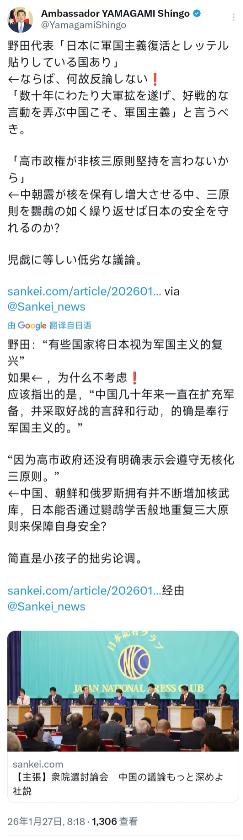 日本驻澳大利亚大使山上信吾今天(1月27日)叫嚣道:“野田佳彦代表:有些国家给日本贴上军国主义复活的标签 ←那为什么不反驳❗ ‘几十年来进行大规模军备扩张、玩弄好战言行的中国,才是军国主义’。 ‘因为高市早苗政权没有说坚持无核三原则。’ 在中朝俄拥有并扩大核武器的情况下,像鹦鹉一样重复三原则就能保护日本的安全吗? 近乎儿戏的低劣议论。”   山上信吾的这套逻辑,根子上是把中日两国的安全逻辑倒了个儿。他说中国搞军备扩张是军国主义,却选择性忽略一个基本事实:中国近代百年被侵略的历史,刻在骨头里的是对"国无防不立"的警惕。就像家里曾经被抢过的老人,攒钱装防盗门,总不能说是要出去抢劫吧?   中国裁军百万的记录摆在联合国档案室,国防预算占GDP比重常年低于2%,连美国智库都承认,中国军力增长始终围绕"反介入/区域拒止"的防御需求——台海、南海的岛礁建设,本质上是给自家院墙加固,防止别人开着军舰飞机上门挑衅。   日本对"军国主义"的定义尤其值得玩味。翻翻战后史,中国最后一次大规模军事行动是1979年对越自卫反击,之后40多年没有主动开过一枪。   反观日本,2013年突破武器出口三原则,2015年通过新安保法允许集体自卫权,2023年防卫预算首破GDP2%,连续多年成为全球第三大军费支出国。   这些动作,恰恰是在突破二战后国际社会给日本划定的和平框架。山上信吾把中国正常国防建设说成"军国主义",就像纵火犯指着救火的消防员喊"你拿着水管好可怕",逻辑荒诞却藏着心机——试图把战后秩序的维护者污名化,为自己解绑锁链。   更关键的是核问题的双标。中国自拥核以来始终奉行"不首先使用"政策,是唯一承诺无条件不对无核国家使用核武器的核大国。而日本嘴上喊着"无核三原则",实际呢?美国智库早就披露,日本储存的钚材料足够制造数千枚核弹,每年花费数亿美元维持核技术研发体系。   这种"非核保有"状态,本质上是给自己留着核武选项的"模糊战略"。现在山上信吾拿中朝俄的核武说事,说白了是想借外部威胁,打破日本国内对拥核的禁忌——就像二战前日本军部惯用的"外部危机论",先制造恐慌,再推动扩军。   这套话术的听众是澳大利亚,就得算算地缘账。澳大利亚民众可能不知道,中国军舰访问悉尼港时,官兵主动帮忙清理海滩垃圾;而日本自卫队舰船近年频繁穿越南海,去年还和美军搞过"离岛夺还"演习。   中国在太平洋岛国修的是渔港和医院,日本给的援助附带"防务合作"条款。山上信吾说"中国好战",却不敢提2022年日本战机在东海对中国军机实施"火控雷达锁定",这种军事挑衅行为,在任何国家都是触发战争的红线。   深层看,山上信吾的逻辑漏洞百出,却精准踩中西方对"非西方崛起"的焦虑。他刻意忽略一个文明的基因:郑和下西洋时,明朝舰队吨位是哥伦布船队的百倍,却没有占领一寸土地;今天中国在吉布提建保障基地,是150年来首次在海外驻军,驻地面积不到美军基地的十分之一。这种"扩张",和19世纪日本殖民台湾、20世纪军部侵华的路径截然不同。但西方话语体系里,总习惯用自己的历史经验解读中国——就像戴着染血的眼镜,看谁都是刽子手。   最值得琢磨的是日本的身份焦虑。作为二战战败国,日本宪法第九条写着"永远放弃发动战争的权利",但近年来修宪声浪此起彼伏。   山上信吾们的话术,本质上是想把中国塑造成"新敌人",从而合理化自身的军事松绑。他们不提日本至今未彻底清算军国主义历史,却指责中国"贴标签";不提自卫队近年频繁参与美军海外行动,却炒作中国正常军演。这种颠倒黑白的话术,在熟悉东亚近代史的人看来,不过是历史倒车的前奏。   当山上信吾说"中国才是军国主义"时,其实暴露了日本右翼的深层恐惧:他们害怕中国的发展模式,不需要殖民掠夺也能崛起;害怕中国坚持的战后秩序,不允许军国主义幽灵复活;更害怕亚洲国家不再接受"日本特殊论"。这种恐惧,让他们宁愿扭曲事实,也要把水搅浑。   而澳大利亚民众如果了解,中国连续12年成为澳最大贸易伙伴,日本却在澳农产品市场设置重重壁垒,或许会明白:谁在真心做生意,谁在拿安全当生意。