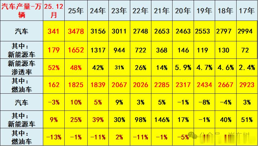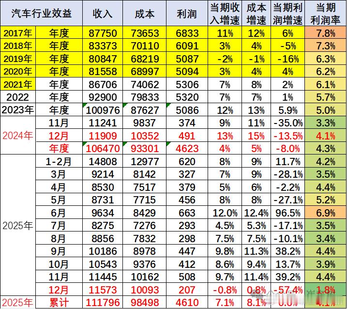 2025年,中国汽车产量达到 3478 万辆(同比增长 10%),行业营收达到 111796 亿元人民币(同比增长 7.1%)。其中成本 98498 亿元(同比增长 8.1%),利润4610亿元(同比增长 0.6%);利润率降至 4.1%,12 月的 1.8% 创下近期低点。原材料、智能化相关成本都在走高,再加上市场竞争的影响,车企的盈利压力确实不小。信源:崔东树2025年汽车行业利润4610亿元新能源汽车