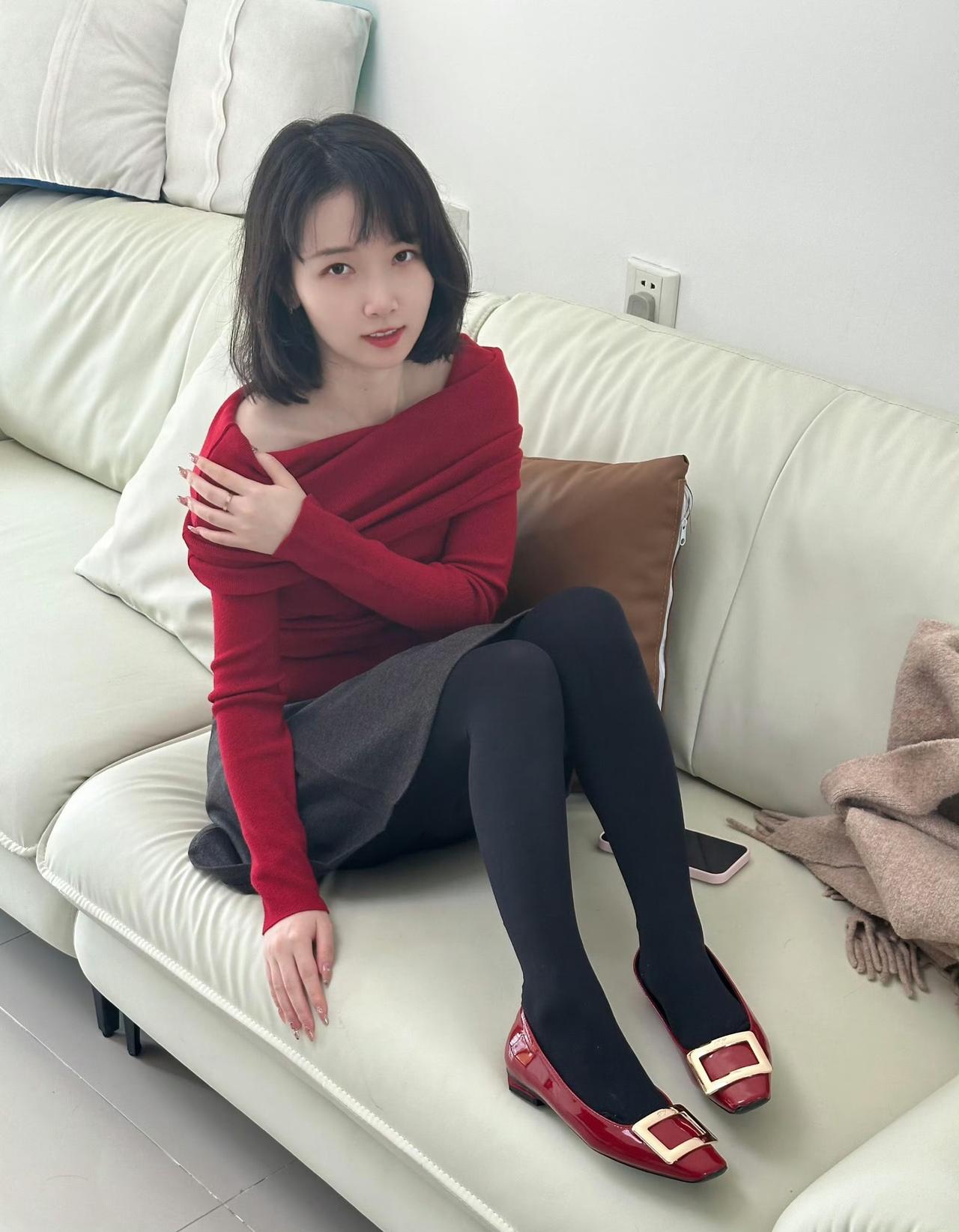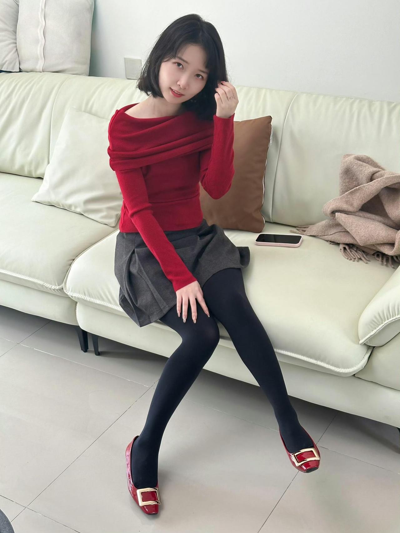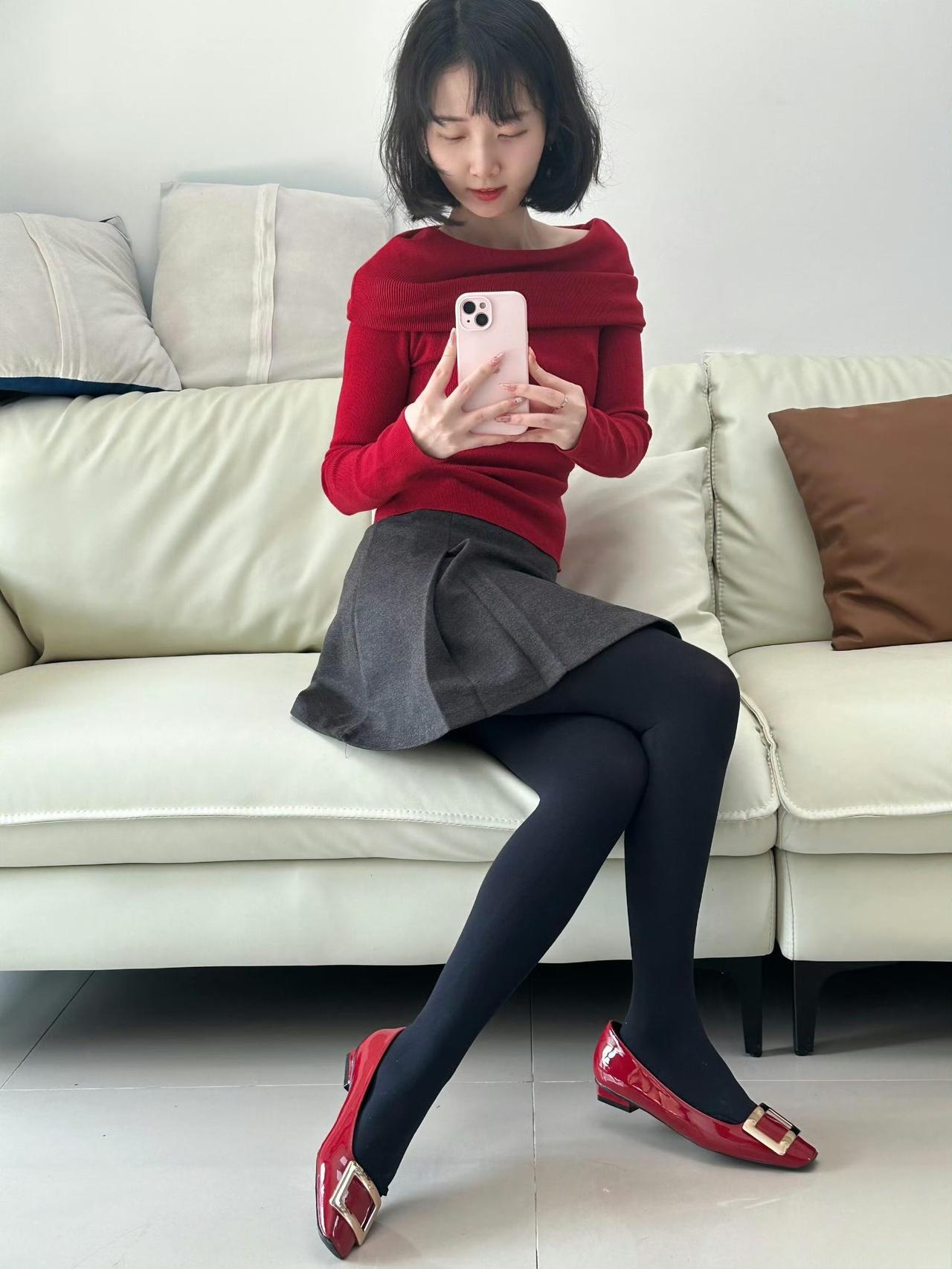 这套穿搭是明艳温柔的红灰搭配,把浓烈色调与柔美元素融合。红色露肩针织衫自带明艳温柔感,露肩设计注轻熟感;搭配灰调短裙,中和红色的浓烈,显利落得体。 搭配红色金属扣鞋强化轻熟精致感,和浅色系居家环境的柔和氛围高度契合,充分展现穿着者明艳温柔的轻熟魅力。黑红色穿搭 温柔红色穿搭