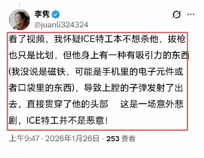 李隽说,ICE不是故意开枪的,是因为对方身上有磁铁,导致子弹发射的。 按说九年义务教育应该学过物理吧?为啥能说出这种反常识的话? 所以不是九年义务教育的问题,是李隽移民之后被当地环境污染了脑子,智商下降了,退化了! 环境影响人,这话没错!