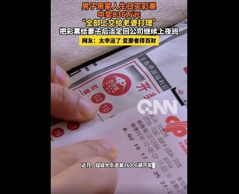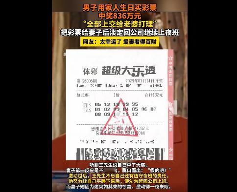 一男子以家人生日为号买彩票中 836 万,将彩票交给妻子打理,自己淡定返回公司继续上夜班,把奖金全权交由妻子处置。 男子的这波操作看似佛系,实则戳中了多少婚姻里的现实痛点! 这年头,多少人为了钱反目成仇,夫妻因财产算计撕破脸,可这位大哥倒好,天降横财却心如止水,不飘不躁还懂得放权,这份清醒和格局,真的让人佩服! 彩票中奖是运气,可守住运气靠的是人心。把奖金交给老婆,不是怂,而是信任,是知道一个家的安稳,从来不是一个人攥着钱,而是两个人心往一处想。 更难得的是他中了奖还照常上夜班的淡定。 这位大哥清楚,横财是锦上添花,不是生活的全部,踏踏实实的日子,才是最稳的幸福。