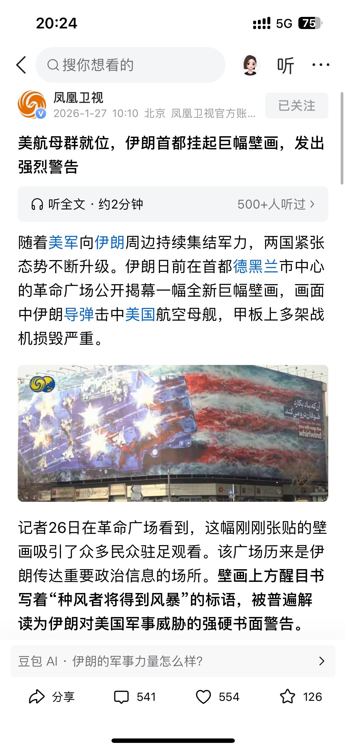 伊朗旗子升完了?现在不升旗子了,开始挂巨幅壁画展示强烈警告了! 美国是派大批舰队,航母战斗群来伊朗周边展示威慑!然而伊朗是在首都挂起巨幅壁画,向美国展示强烈警告,巨幅壁画画面显示伊朗导弹击中美国航空母舰了!
