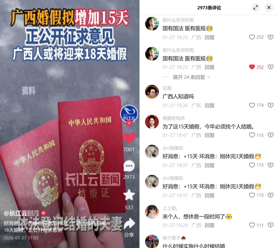 广西拟将婚假增至18天 消息一出来,大家直接分成两派:未婚的摩拳擦掌,说啥都要等政策落地再领证;刚休完3天短婚假的,拍着大腿喊生不逢时。 这反应其实也正常。这年头职场卷得没边,别说好好办婚礼、度蜜月,能凑个完整双休都得偷着乐。广西从3天跳到18天,虽说和山西、甘肃的30天比还有差距,但对之前只能啃3天假的本地人来说,已经是颗难得的定心丸,终于敢正大光明停下来,把人生大事办得像样点。 毕竟,对现在的年轻人而言,能有一段不用挂心工作的完整假期,才是最实在的结婚福利。就盼着这政策能早点落地了。