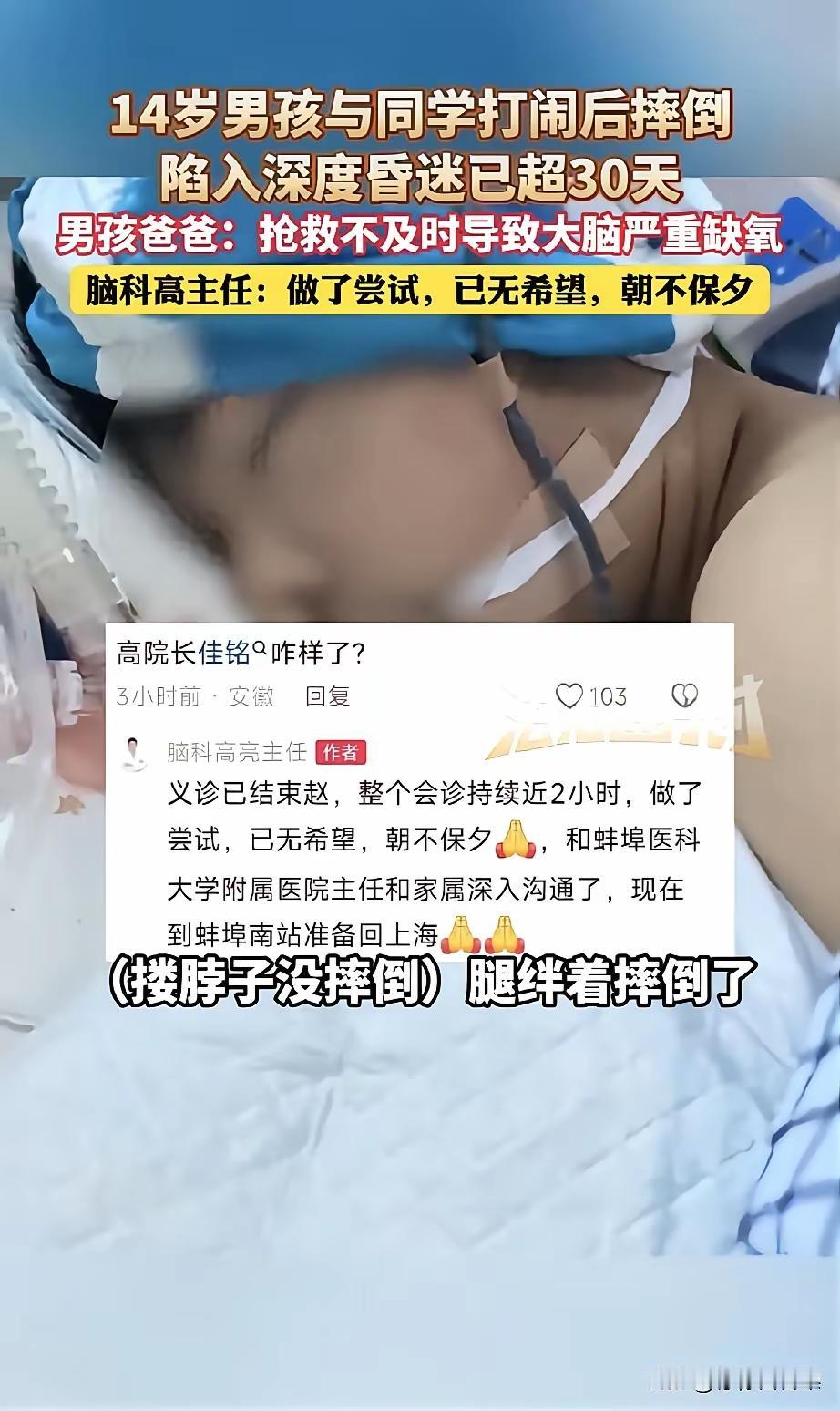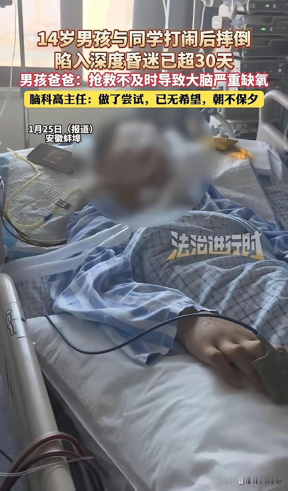 安徽蚌埠一个14岁的男孩在学校里与同学打闹,同学搂着他的脖子一绊,男孩头撞到地上,结果是脑袋缺氧坏死,己经在ICU病房抢救了30天,仍然是处在昏迷状态,医生的诊断是随时都可能死亡,没有任何希望也没有救治的价值,男孩的父亲哭了大叫如果是学校早点拨打急救电话,孩子还有希望。