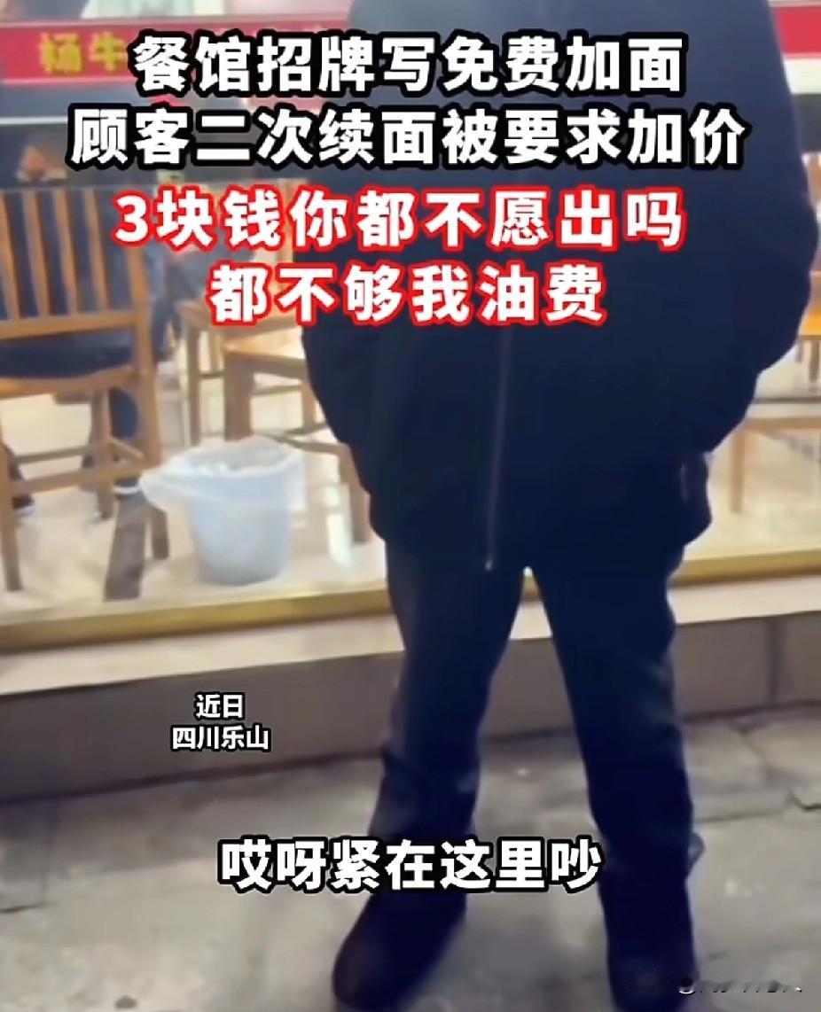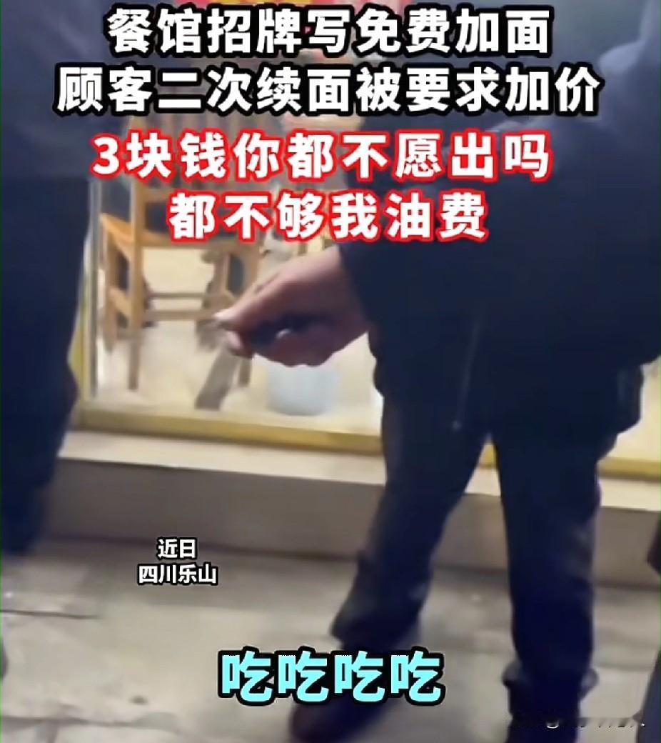 就为了三块钱还好意思报警?不够我油费的,吃吃吃,就为了三块钱你也要报警,我替商家出了,你吃吧! 事情是这样的:一位东北的网友去乐山旅游,肚子饿了就去某餐厅吃饭,这位网友据说是一名大学生,他看到商家在店里贴的宣传词是可以免费续面的。 网友续面一次后,感觉还没吃饱,就选择第二次续面,哪想到商家不乐意了,不让他续面了,还把碗收走了。 东北网友感觉商家的做法与免费续面的宣传不符,就与商家争论上了。 报警后,出警的同志说的话,让人感觉很无语,他说就为这点小事,还报警,不够我出警的油费,于是这位同志就想和稀泥,这三块钱我替你出吧! 个人觉得,出警的这位同志他显然没有明白,双方的矛盾点并不是因为那三块钱,而是商家虚假宣传的问题。 商家宣传免费续面,结果真当有人无限续面,商家立马变脸。 可能商家觉得免费续面,续面续一次就够了,哪有人会续第二次呢? 奈何真遇到续第二次第三次的消费者,商家怕了,你续二三次面,我岂不是亏大了!因此才收走消费者的碗,及时止损!