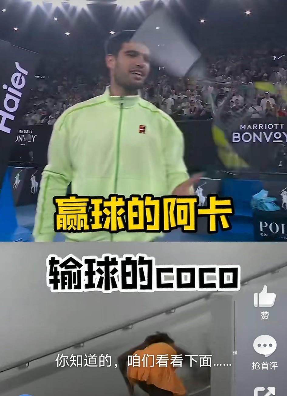 球拍不是原罪,跟对主人很重要…… 赢球的阿卡,开心得玩起球拍;输球的高芙,愤怒得狂砸球拍。