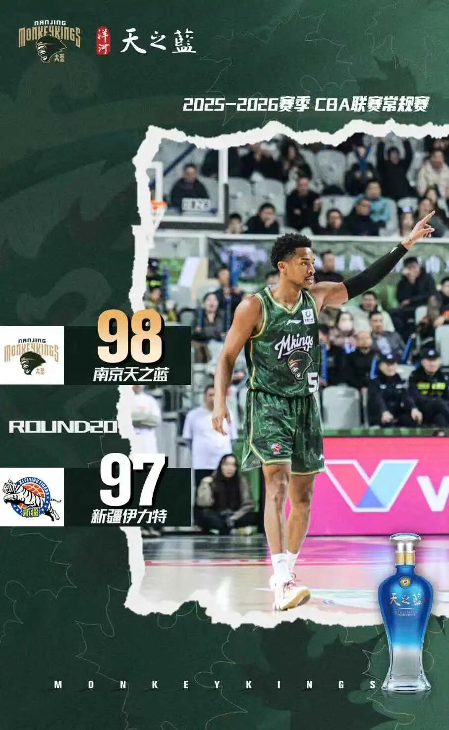 末节决战,沙拉木两罚中一,汉兹撤步三分清脆入网。西尔扎提抛投打板,马鑫鑫内线再取两分。吴冠希、齐麟、哈里斯、沙拉木联手反超比分,球队暂停调整。哈里斯连得4分,沙拉木侧翼远投。汉兹突破上篮打破局面,吴冠希再度补篮,汉兹连续造成杀伤罚球追分。沙拉木上篮打进,汉兹再上罚球线。祝铭震抢断,汉兹反击飞身扣篮将分差迫近至只差3分,新疆队暂停调整。汉兹斜侧杀出再度成功抢断,反击中再遭侵犯两罚全中,分差仅差1分。随后,柏清切入接汉兹助攻上反篮打进反超比分!新疆队接连4罚不中,球队最后一攻消耗时间,留给对手2.5秒。哈里斯最后漂移三分不中,全场比赛,南京天之蓝98-97新疆伊力特。