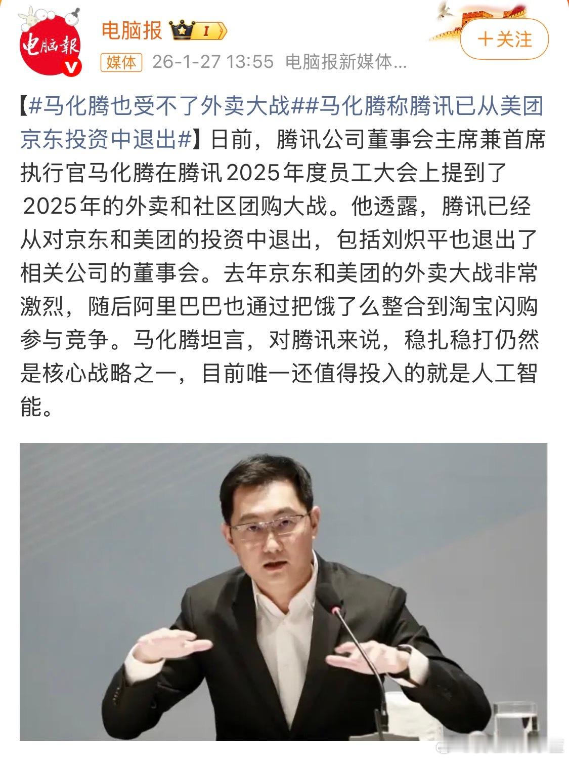 马化腾称腾讯已从美团京东投资中退出外卖大战连马化腾都看不下去直接退出投资了…