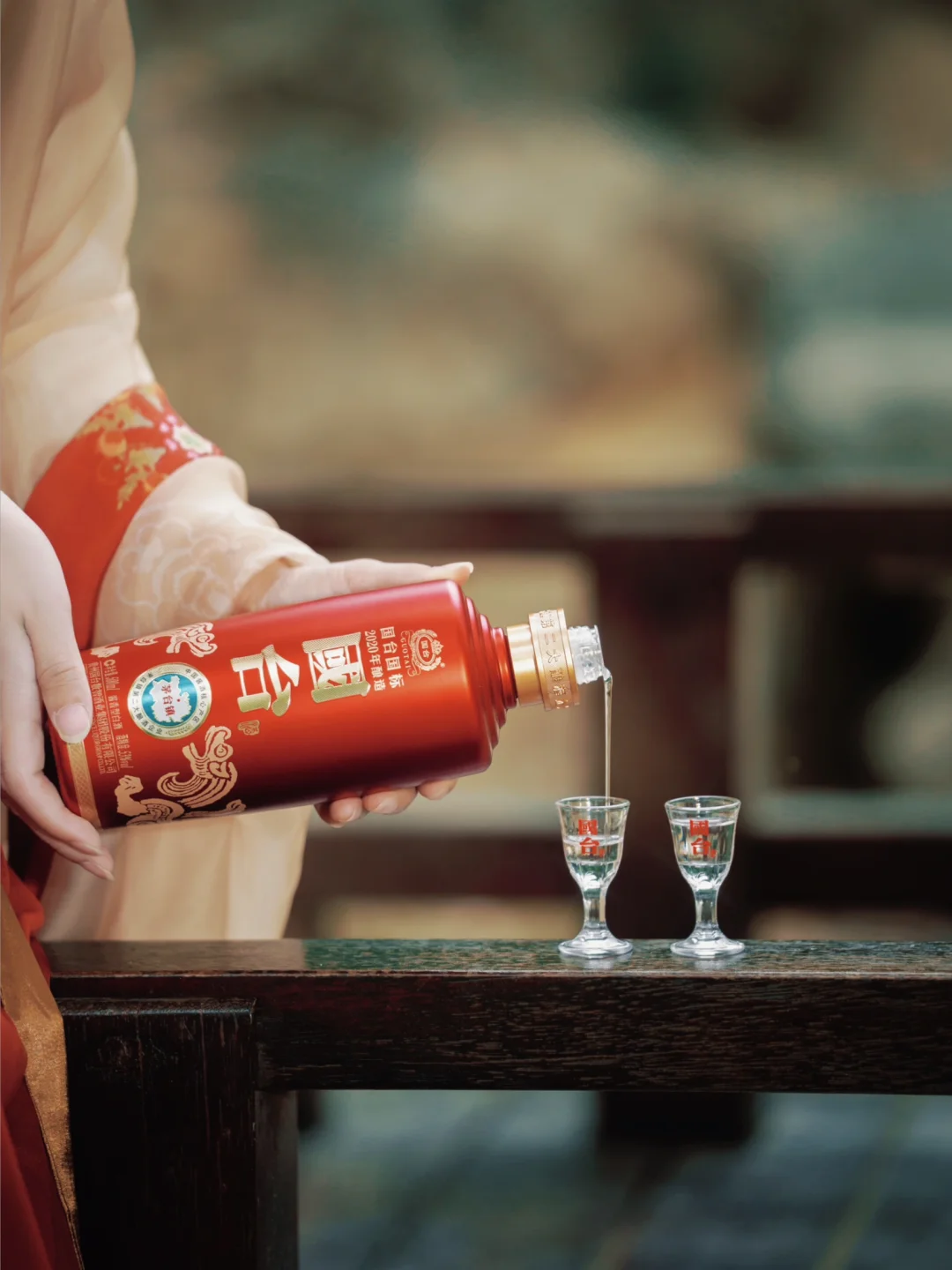 轻旋酒杯,国台国标酒清透的酒液泛起柔润光泽,恰似池水的粼粼波光,微黄透明,又似诗仙笔下“金樽清酒斗十千”的琼浆玉露。