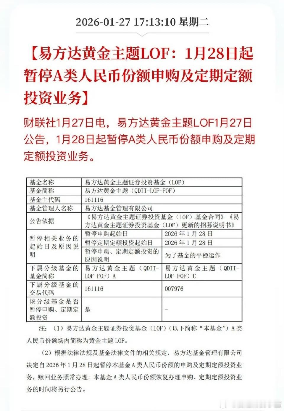 易方达黄金主题LOF将暂停申购黄金白银LOF都不让买了。