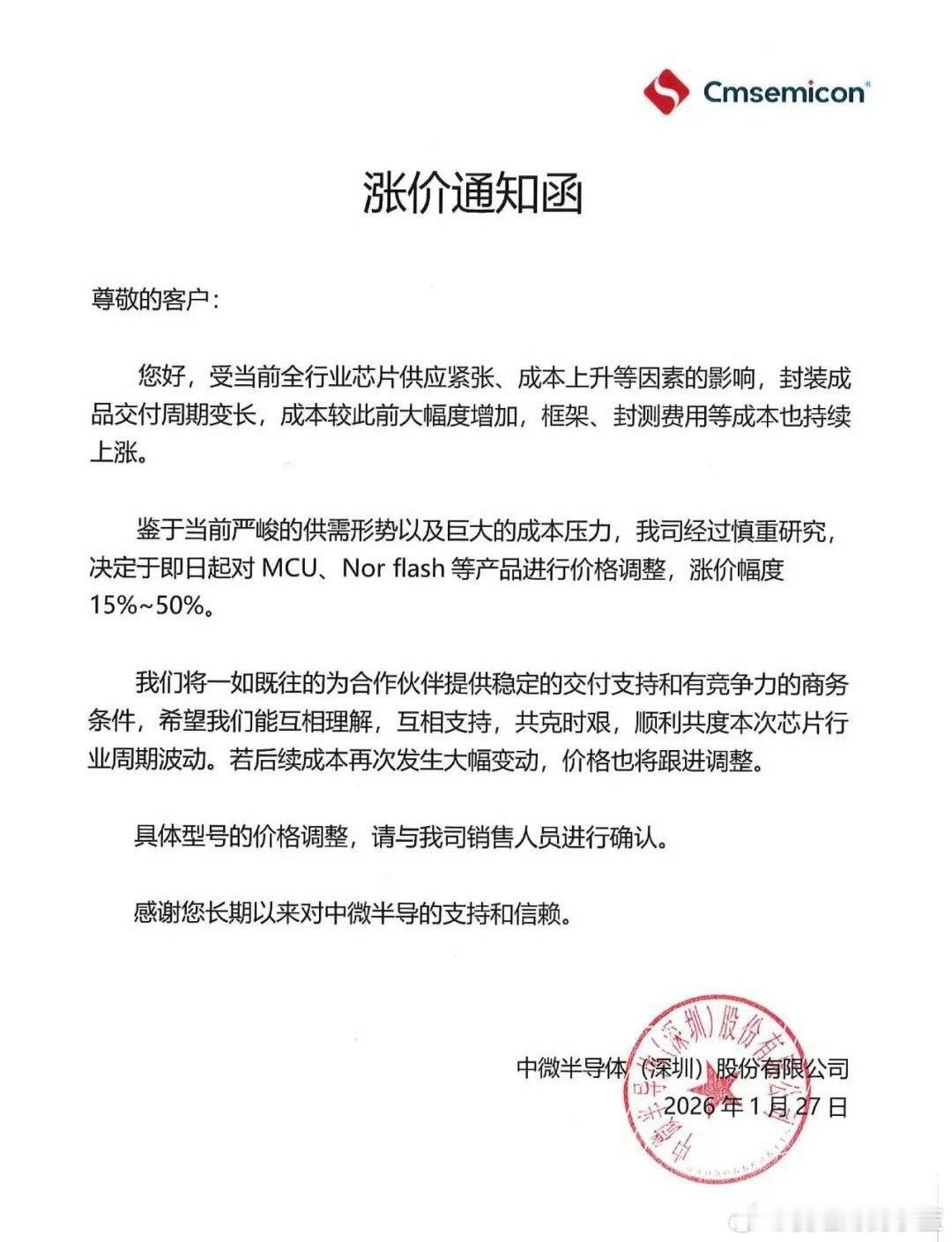 中微半导发布涨价通知函中微半导发布涨价通知函涨幅15%~50%