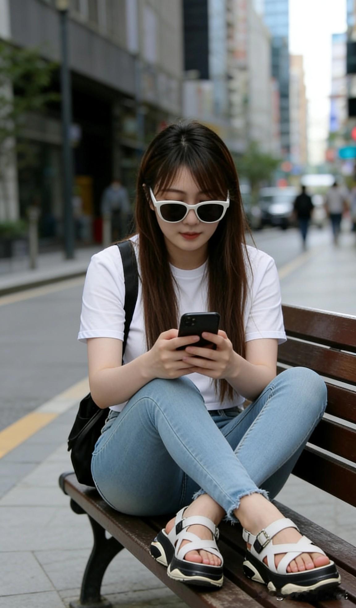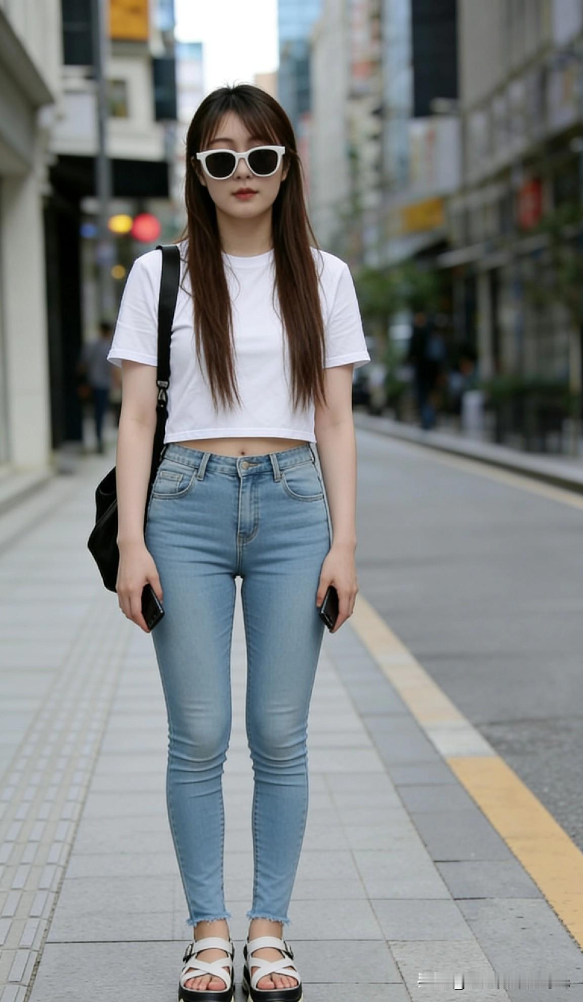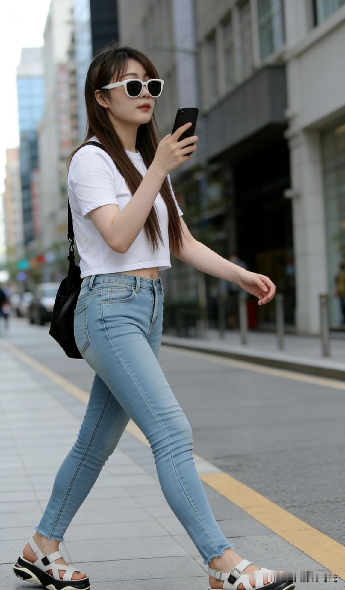 都市少女风,白色T恤+牛仔裤,轻松自在!👗👠📱