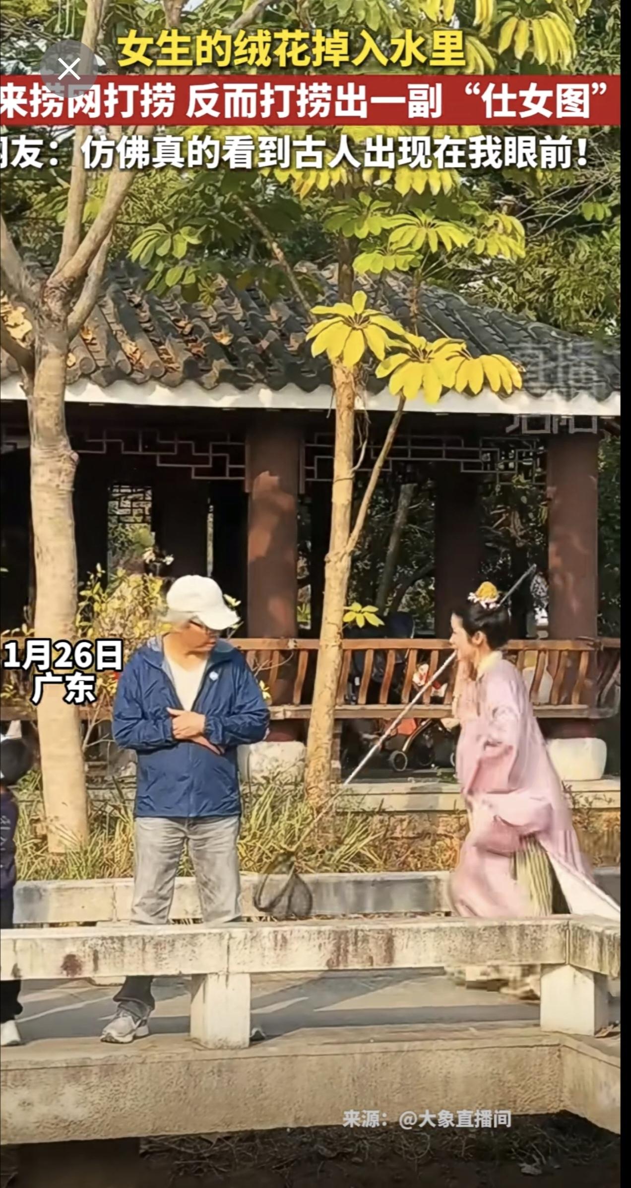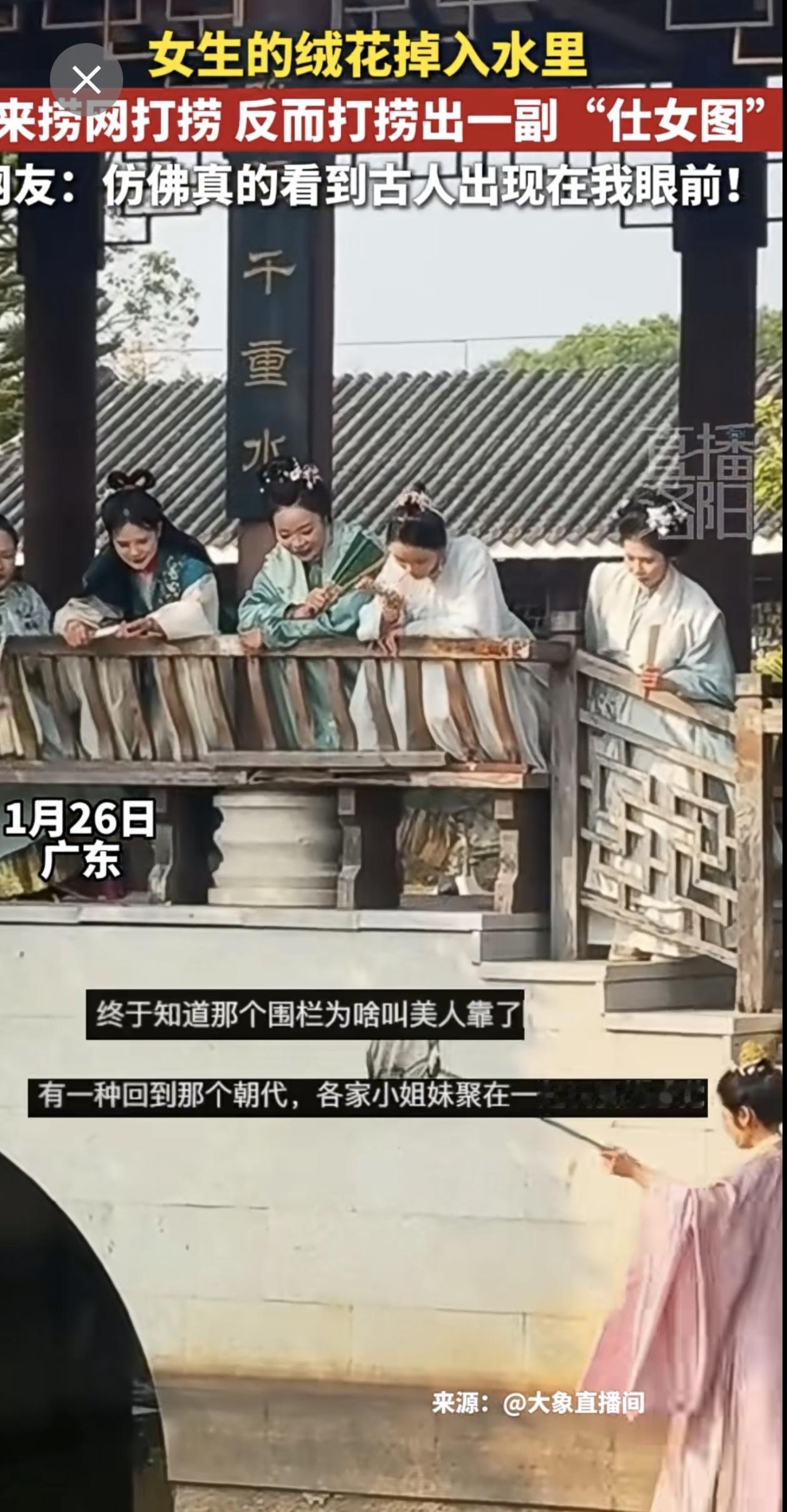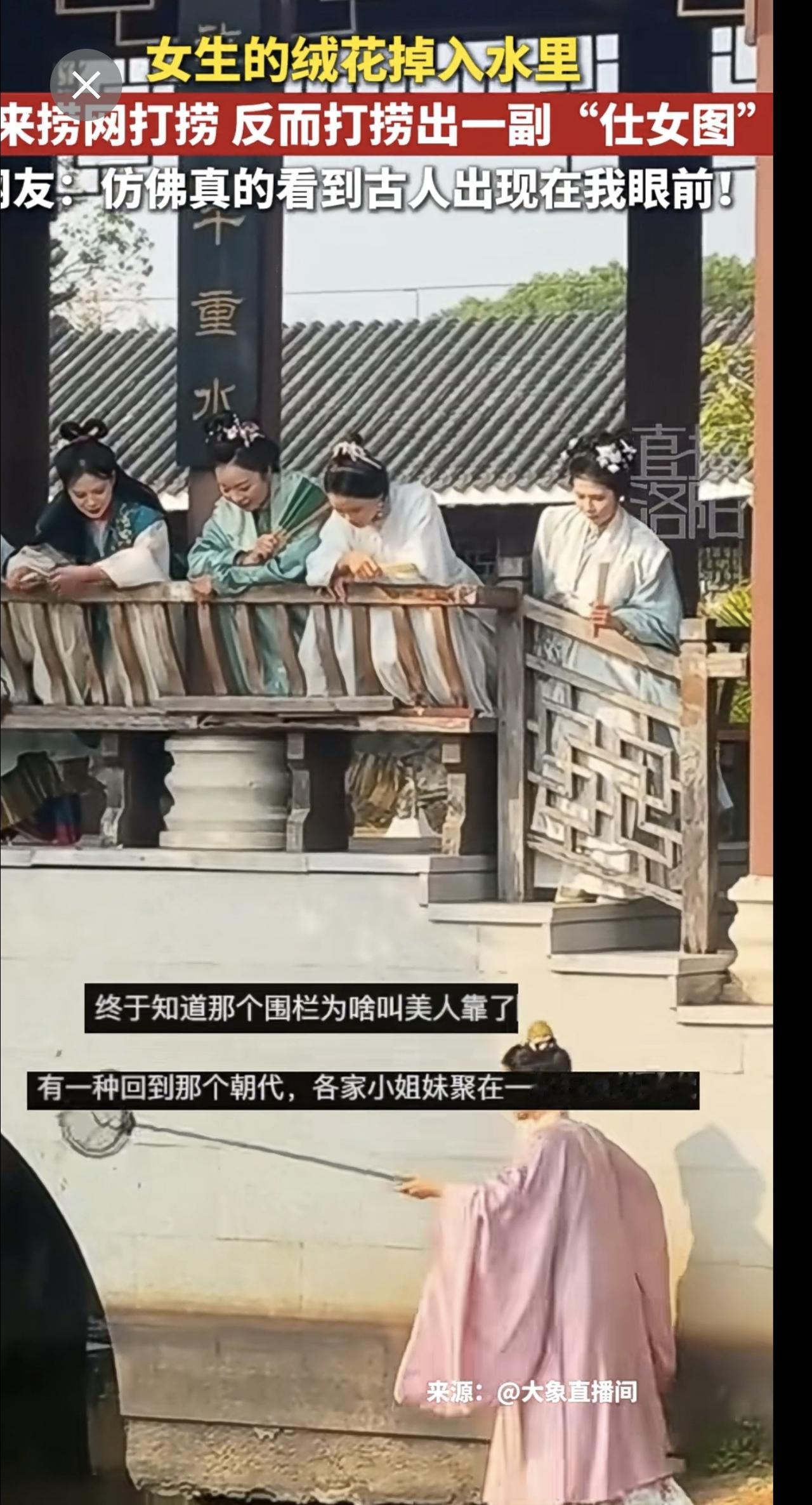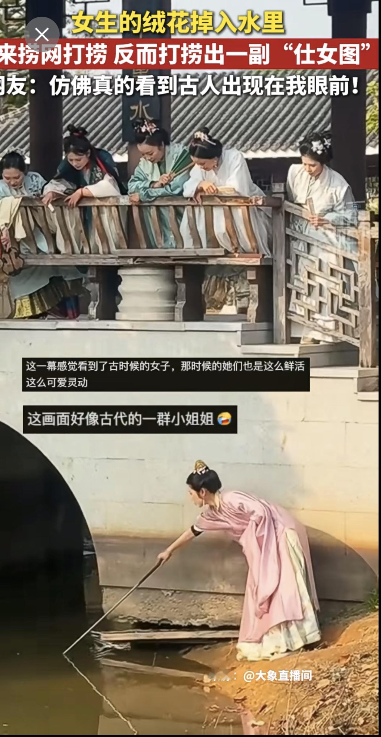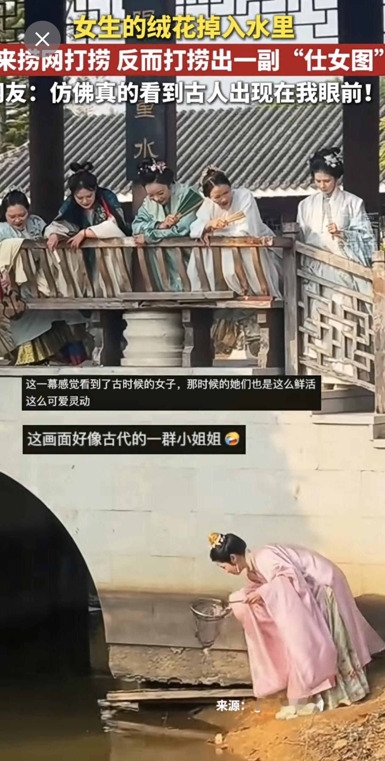 女生的绒花掉到水里借来捞网打捞,反而捞出一副“仕女图”~