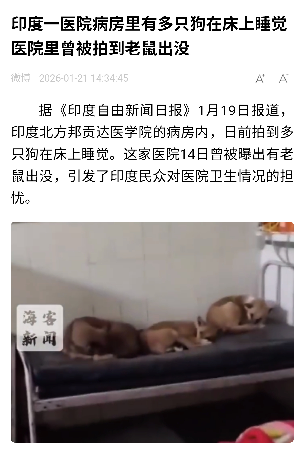 专家说的肯定是有根据的,然而,据《印度自由新闻日报》1月19日报道,印度北方邦贡达医学院的病房内,日前拍到多只狗在床上睡觉。这家医院14日曾被曝出有老鼠出没,引发了印度民众对医院卫生情况的担忧。专家称勿用老眼光看待印度疫情