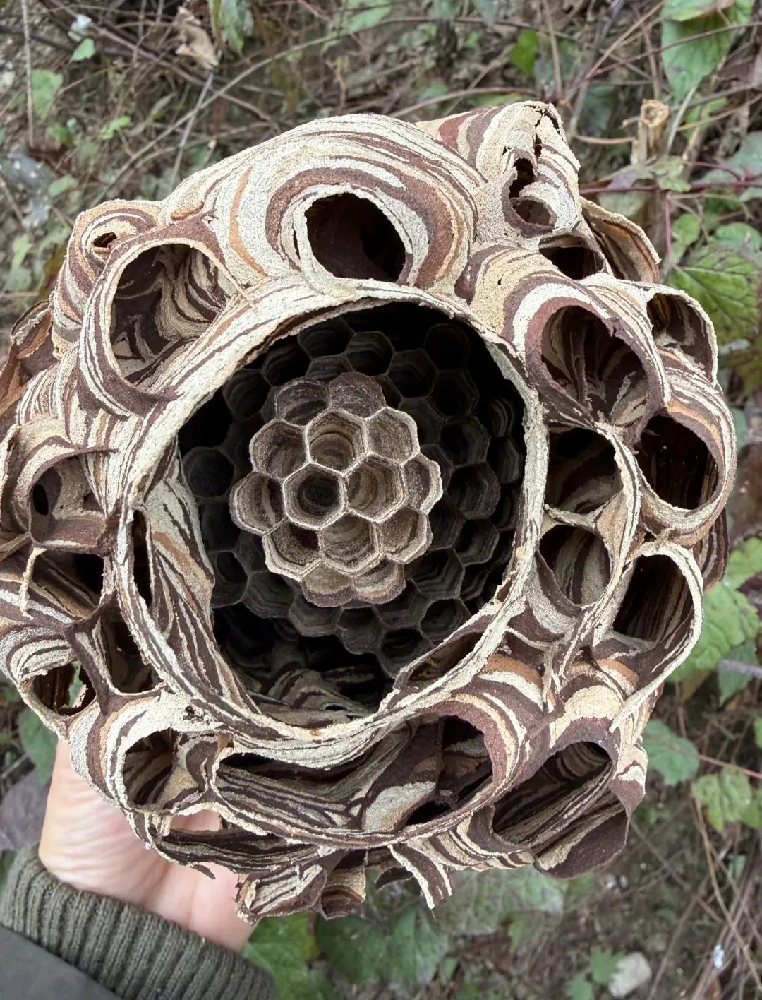 拾到一个空置的蜂巢 ,造型真别致!像是精巧的复式建筑 ,里面有排列整齐的六边形孔洞,想必曾是蜜蜂们忙碌的育婴房,外面重叠的这些孔是干嘛的?