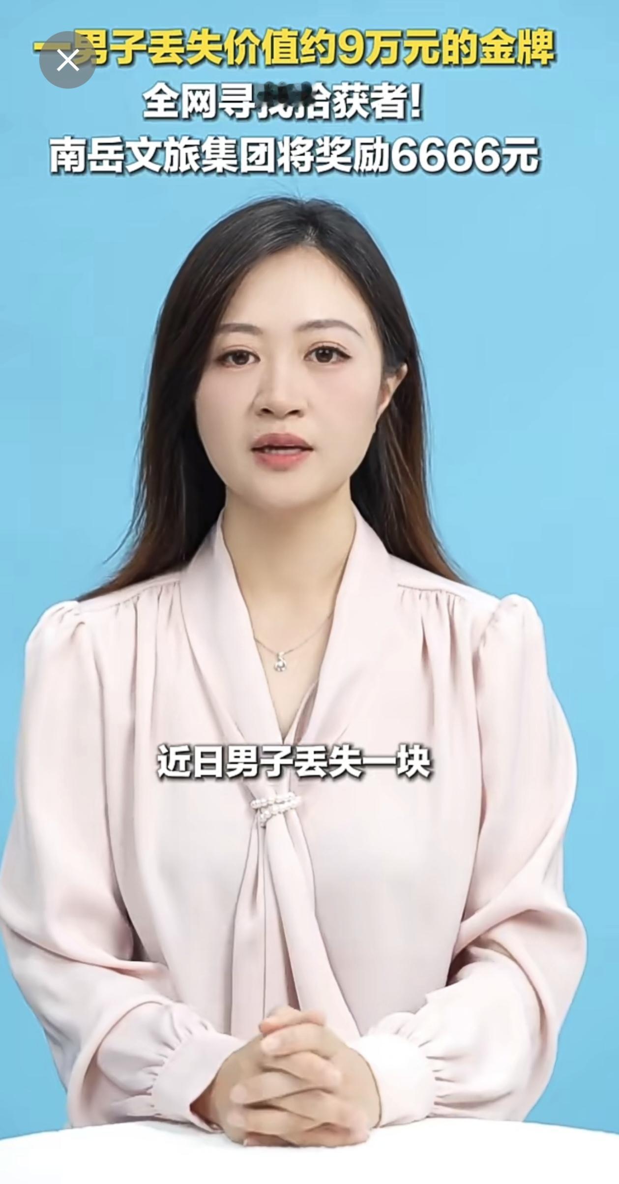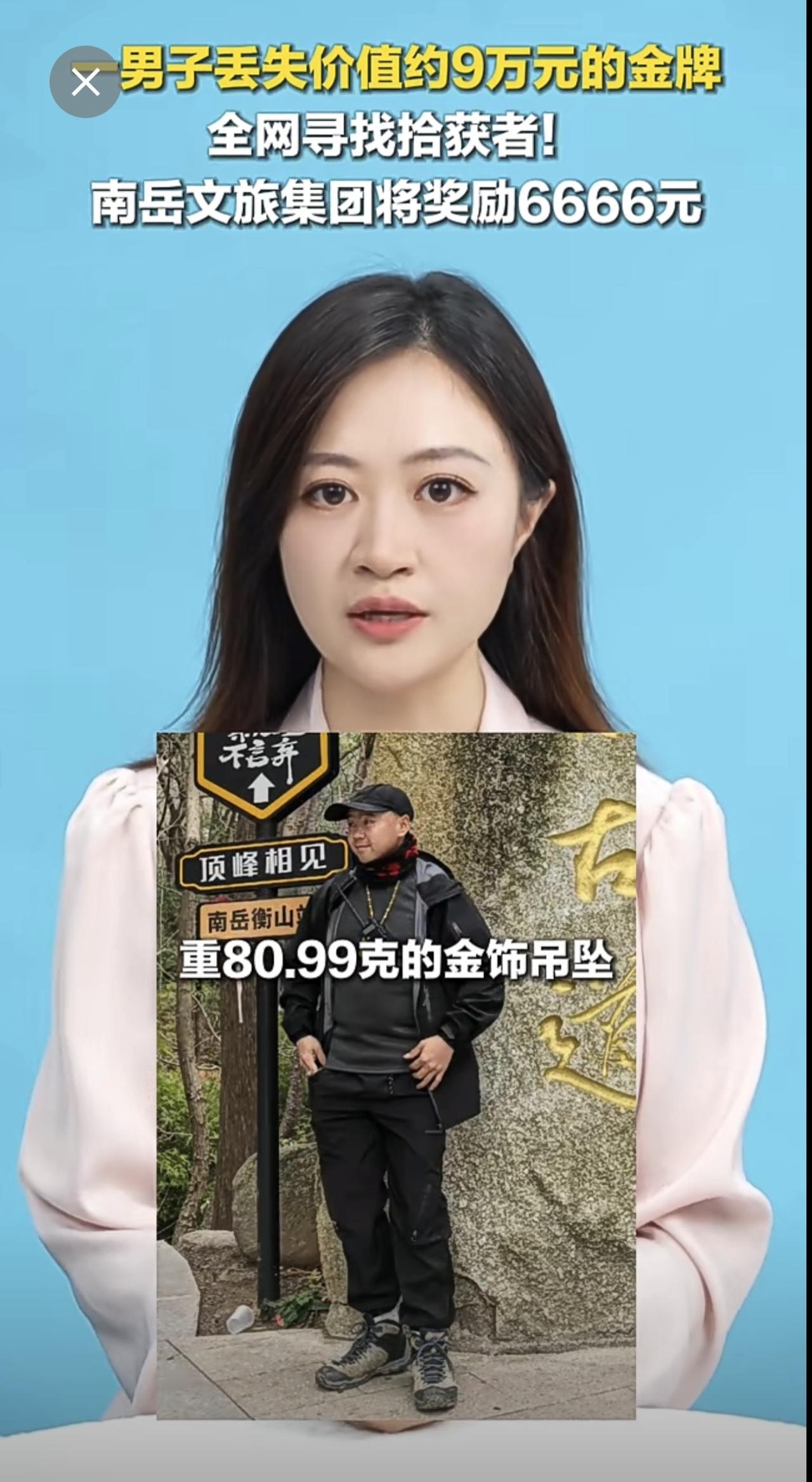一男子在湖南衡山丢失一块价值约9万元的黄金吊牌,若有拾获并归还者,南岳文旅集团将奖励6666元。拾金不昧 遗失物品