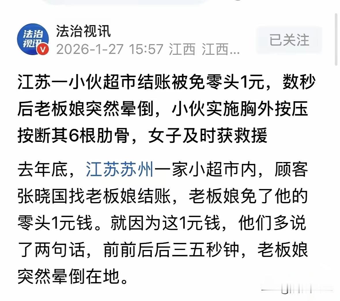 江苏苏州,男子去超市买东西,结账时老板娘给他抹了1块零头,俩人因此多聊了几句,谁知,老板娘聊着聊着突然两眼一黑,晕倒了!男子吓得连忙打120,并在工作人员的隔空指导下,对老板娘实施心肺复苏,男子一刻不敢耽搁,连续按压胸口600次,事后,老板娘虽转危为安,却被按断6根肋骨,她丈夫一句话亮了。 张晓国事后回忆,当时老板娘刚说完“下次常来”,身子就一歪栽在收银台边。他盯着人倒下去的瞬间,脑子里一片空白,抓起手机就按120。电话那头的调度员让他别慌,立刻开始胸外按压,还教他怎么找按压位置。 他蹲下身,按调度员说的,双手交叉压在老板娘胸口。第一次按下去,他听见“咔嚓”一声脆响,吓得手都抖了。调度员在电话里喊“别停!停了人就没了!”,他咬着牙继续,一下接一下,数到600次的时候,救护车才赶到。 送到医院检查,医生说老板娘是突发心梗,再晚几分钟就救不回来了。但同时也说,她的6根肋骨被按断了,得养好几个月。 张晓国当时就懵了。他心想,救人反把人肋骨按断,这事儿闹不好要赔钱。他甚至已经做好了被讹上的准备,连怎么跟老婆解释都想好了。 结果老板娘醒过来,第一句话就是“谢谢你啊小伙子”。她丈夫更是直接拉着张晓国的手说:“断6根肋骨换一条命,值了!” 这话一出,周围的人都松了口气。后来这事儿传到网上,评论区吵翻了天。有人说张晓国太冤,救人还得担风险;也有人说,换了自己可能不敢救,怕被赖上。 我想起去年小区里也有个类似的事。一位老人在楼下突然晕倒,路过的护士想上前急救,被家人拦住说“万一救坏了谁负责”。等救护车赶到,老人已经没了。 现实就是这么讽刺。明明是救人的好事,却要先掂量后果。很多人不是不想救,是怕救完被反咬一口。 医生后来也出来科普,说胸外按压按断肋骨是常见现象,尤其是中老年女性,骨质疏松,按压时很容易骨折。国际急救指南里也明确,就算按断肋骨,也不能停止按压,因为生命永远比肋骨重要。 但就算有这些科普,真遇上事,还是有人会犹豫。张晓国的运气好,遇到了明事理的一家人。换作不讲理的,说不定就把他告上法庭了。 这事儿最该让人反思的,不是肋骨断没断,而是我们到底敢不敢在关键时刻伸出手。 要是你遇到这种情况,会毫不犹豫地上前救人吗?你觉得救人者该为意外受伤担责吗?