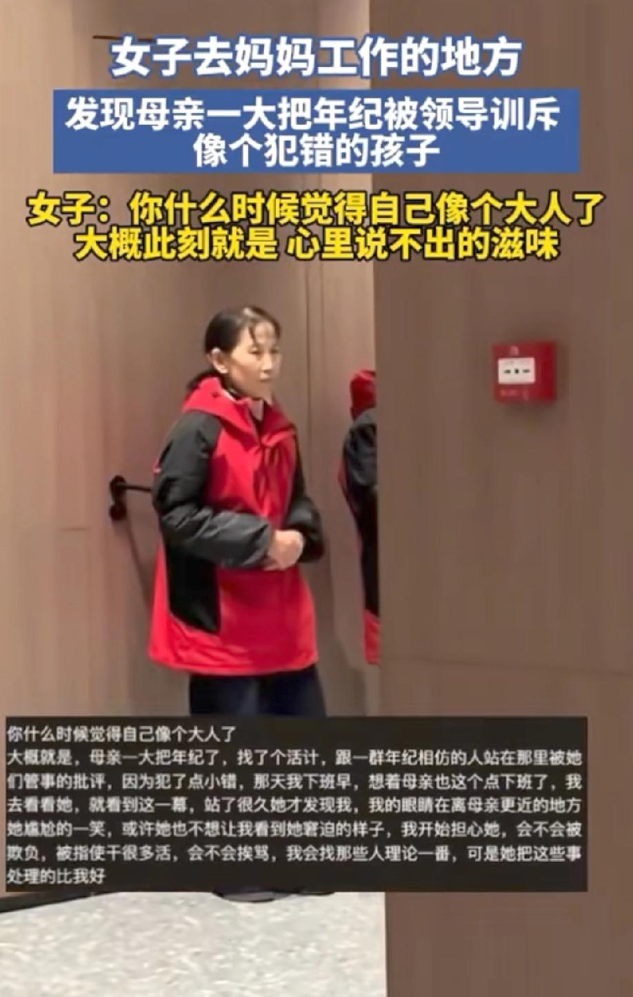 “太心酸了!”陕西,女子下班去接母亲,看到母亲和同事们排成一排,被年纪轻轻的领导训斥。好巧不巧,母亲正好看到了女儿,这一刻,她就像个犯了错的孩子,一脸的无辜和无奈。女子突然觉得自己长大了,但不能保护好母亲,心里非常不是滋味。 据重庆城市TV关注1月27日报道,李女士下班比平时早,她想着正好去妈妈工作的地方接她下班,给她个惊喜。 一路上,李女士想象着妈妈见到自己时开心的样子,脚步也轻快了许多。 可当李女士走到妈妈工作的那个区域,还没来得及喊“妈”,眼前的一幕就让她像被钉在了原地,刚才那点轻松愉快的心情瞬间消失得无影无踪。 只见妈妈和好几个跟她差不多年纪的阿姨,低着头,规规矩矩地站成一排。 一个看起来二十出头,年纪差不多能当她们女儿的年轻管事,正在前面大声训斥着,就因为一点小小的工作失误,这位管事把她们数落得灰头土脸。 妈妈她们一个个都不敢吭声,脸上全是小心翼翼的表情。 李女士太清楚了,她们也不想被人指着鼻子这么骂,但她们怕被开除,一大把年纪了,找份工作真的不容易。 看到这一幕,李女士心里真不是滋味。 在她眼里,妈妈一直是家里的超人,从小到大,不管遇到什么困难,妈妈好像都能扛过去。 可现在,妈妈却像个做错事的孩子一样,在那里受着训斥,那么卑微,那么无助。 就在这时,妈妈好像感觉到了什么,无意间抬起头,一眼就看到了不远处站着的李女士。 妈妈的脸“唰”地一下就红了,眼神里充满了尴尬和慌乱,整个人显得更加局促不安,手不停地在搓着,好像不知道往哪儿放才好。 李女士也一时不知所措,她知道妈妈肯定难过死了,觉得在女儿面前丢了人,但又无可奈何。 李女士很想冲上去,替妈妈把那个女孩怼回去,不让妈妈受这份气,可是她没那个本事。 她也知道,妈妈这个年纪,找份工作有多难,要是真因为这个丢了工作,妈妈会更难受的。 抛开这次不说,只要妈妈还在外面工作,不管在哪儿,都得领导脸色,今天这事就算躲过了,明天也可能发生。 这一刻,李女士心里又酸又涩,说不出的滋味。 她突然特别痛恨自己,痛恨自己不够强大,痛恨自己不能像妈妈当年保护她那样,为妈妈遮风挡雨,反而还要让妈妈在外面受这种委屈和欺负。 此时此刻,李女士瞬间觉得自己像个大人了,但这种滋味,真不好受,沉甸甸的,压得她喘不过气。 其实,不仅是李女士的母亲,很多母亲一辈子都在为家庭默默付出,操持家务、养育子女,将青春和精力都奉献给了家人。 到了本该安享晚年的时候,却还有许多像李女士母亲这样的年老工作者,为了生活、为了减轻子女负担,依然在职场上奔波。 她们本就身体机能下降,在职场竞争中处于劣势,却还要承受年轻领导不恰当的训斥,小心翼翼地工作,生怕出错丢了来之不易的岗位。 她们的卑微与无奈,是生活的重压,也是社会关怀缺失的体现。 真心希望社会能给予这些伟大的母亲以及所有年老工作者更多的关爱与尊重,企业和管理者能多一些理解与包容,少一些苛责与训斥,让她们在为生活努力的同时,也能感受到温暖与尊严。