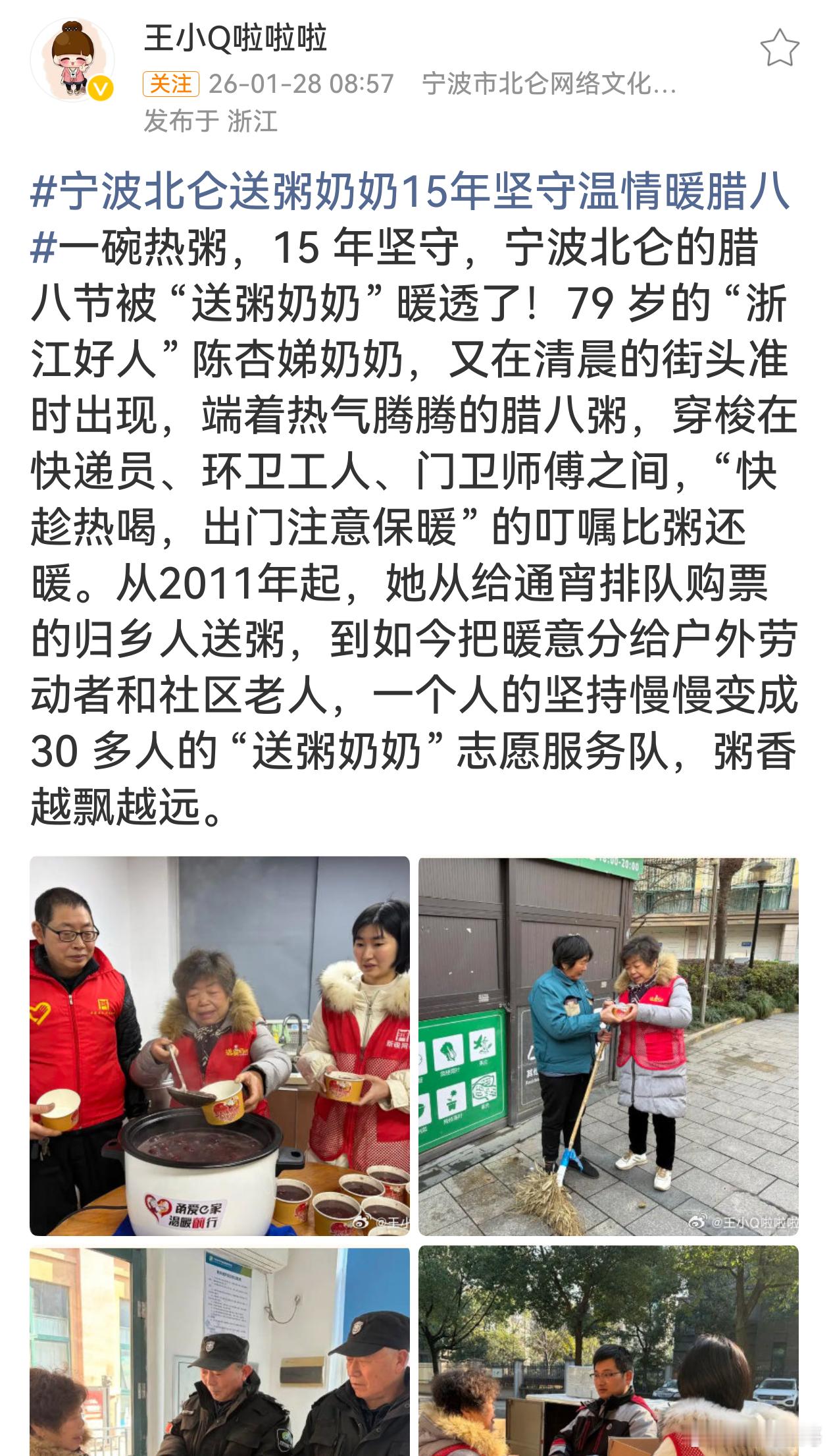 宁波北仑送粥奶奶15年坚守温情暖腊八陈杏娣奶奶用15年的坚守,书写着温暖篇章。一碗热粥,传递着无尽关怀,从归乡人到户外劳动者和社区老人,爱被不断传递。她的善举感召众人,让送粥奶奶队伍壮大。这份坚持与善意,如冬日暖阳,温暖着北仑的腊八节,也照亮我们的心。