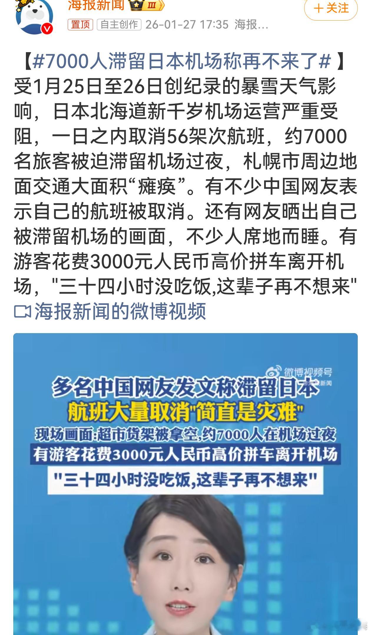7000人滞留日本机场称再不来了这暴雪让日本北海道新千岁机场乱了套,7000人滞留,航班取消、交通瘫痪。有些游客不听旅日警告偏要去,结果遭了罪,有人花高价拼车,34小时没饭吃,直言不想再来。出门在外多留意风险,别让一场旅行成了糟心经历呀。
