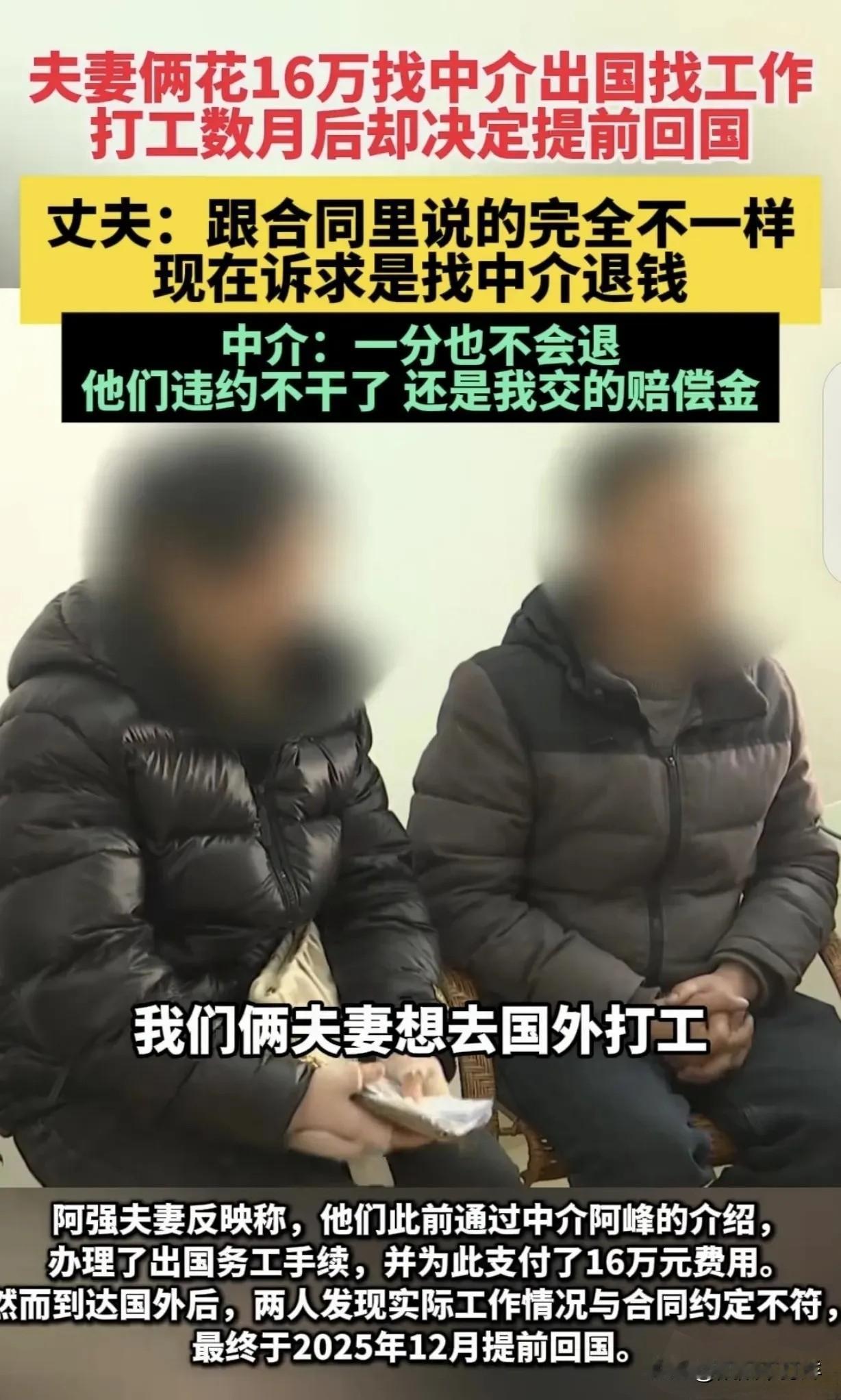 “肠子都悔青了!”福建,一对夫妻花16万中介费,去奥地利打工,两人月工资加起来有3500欧元,折合成人民币28000多元,每周工作时长不超过40小时,可到奥地利后,夫妻俩就傻眼了,因为现实与合同里约定的内容完全不符! 阿强夫妻俩在福建老家守着几亩薄田,日子紧巴巴的。刷短视频时刷到中介阿峰的出国务工广告,画面里是奥地利干净的街道和悠闲的咖啡馆,配文写着“月薪过万、轻松躺赚”。16万是他们掏空家底又借了亲戚的钱凑出来的,临走前,他们把刚上初中的孩子托付给老人,想着熬个两三年,就能给孩子攒够高中和大学的学费,再把老家的破房子翻修一下。 落地维也纳机场那天,天还飘着细雨。来接他们的雇主是个操着广东口音的中年男人,没带他们去合同里写的“市区员工公寓”,而是拉着行李绕到了郊外一栋昏暗的民宅。推开门,一股混杂着面粉和油污的味道扑面而来,所谓的“员工宿舍”就是客厅里用木板隔出来的两个铺位,连个像样的窗户都没有。 第二天一早,阿强就被塞进了饺子厂的后厨。合同里说的“每周40小时”成了笑话,他从早上7点站到晚上8点,擀皮、包馅、速冻,连喝口水的功夫都没有。老板说“多劳多得”,可月底发工资时,说好的3500欧元变成了1800欧元,理由是“原材料损耗要扣钱”。妻子在市中心的中餐馆打工,每天从上午10点忙到凌晨2点,洗不完的盘子、擦不完的桌子,脚肿得像发面馒头,连坐下来喘口气都要被老板娘骂“偷懒”。 最让他们崩溃的是,想回国都成了难题。中介阿峰在微信里直接拉黑了他们,打电话过去,对方只丢下一句“你们自己违约,一分钱不退,还要赔我给雇主的违约金”。夫妻俩蹲在维也纳的街头,看着来往的行人,手里攥着皱巴巴的合同,眼泪混着冷风往脖子里钻。他们想不通,那些在短视频里笑得灿烂的“成功案例”,怎么到自己身上就成了骗局。 这事在老家的村里传开后,有人骂他们贪心,有人说中介缺德,还有人偷偷去问那个中介的联系方式,想着“说不定自己运气好,能碰到真的好工作”。这就是最扎心的地方——总有人抱着侥幸心理,觉得骗局不会落到自己头上,却忘了那些被收割的韭菜,当初也是这么想的。 我们总说“出国淘金”,可真正的淘金者,从来不是靠中介的一张嘴。阿强夫妻俩的遭遇,不是个例。每年都有无数像他们这样的普通人,被“高薪”“轻松”的诱饵勾住,最后落得人财两空。中介的套路大同小异:用虚假合同画饼,用模糊条款挖坑,等你到了国外,才发现叫天天不应,叫地地不灵。 撑了不到半年,夫妻俩就打包回了国。 你身边有没有听过类似的出国务工骗局?如果是你,花光家底遇到这种事,会选择硬扛到底还是立刻回国?评论区聊聊你的看法。