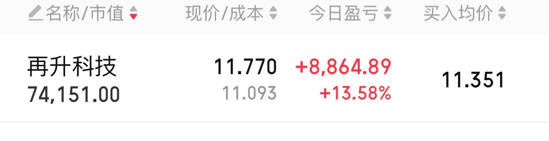 今天在再升科技这只股上的操作,真是让我又庆幸又有点小遗憾。我还是有点胆小啦,这股涨停了,可我T走了一半。通过做T,今天在它上面盈利了13.58个点。看看商业航天板块里的兄弟们还在“挨打”,我这盈利就显得格外幸运。早盘我就感觉再升科技不简单,虽然低开,但一下就涨了4个点,回落到2个点时,我果断入手4200股。这一天,股价走势那叫一个曲折,多空双方激烈博弈。我没贪,涨到8个点就卖了一半。现在想想,要是再大胆点就好了,但落袋为安,也算不错啦。
