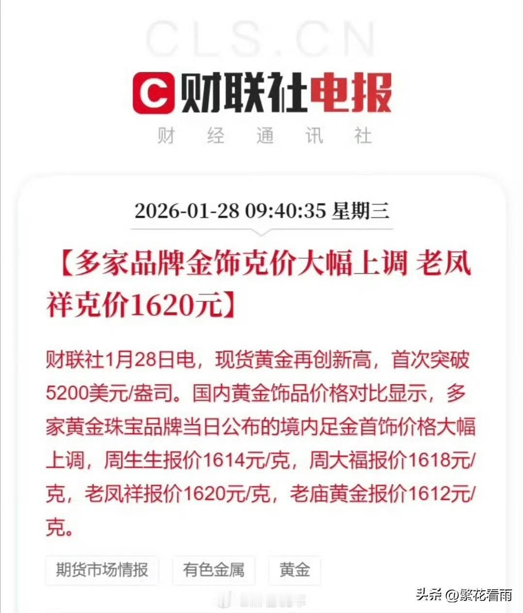 黄金又又又涨了,多家品牌的足金首饰价格大幅上调,周生生报价1614元/克,周大福报价1618元克,老凤祥报价1620元/克,老庙黄金报价1612元/克,有网友评论工资条上的数字几年没动弹了,金价涨得倒是比血压还快,本来以为辛苦一年年底能硬气一回,结果一看这金价,连根像样的细链子都买不起了。(图片来源于网络侵删)