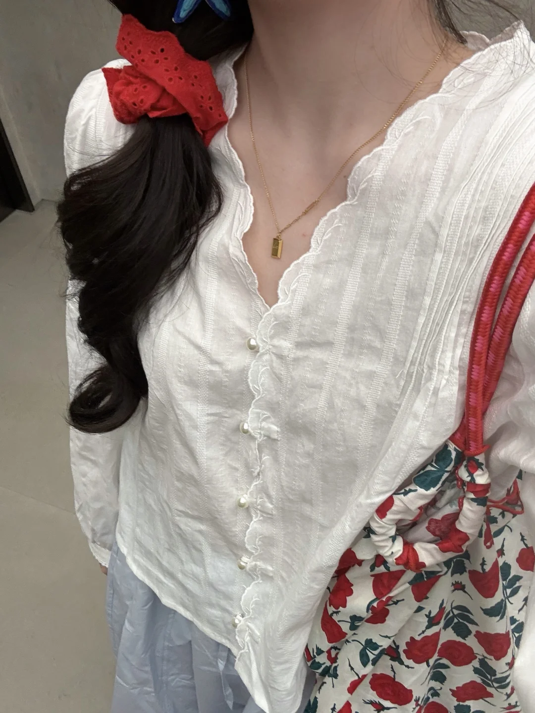 这个泡泡袖花边衬衫也可以塞进裤子里穿