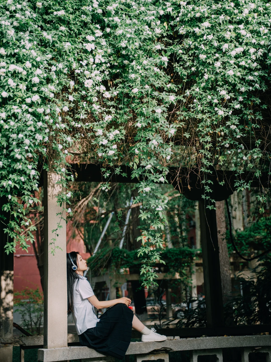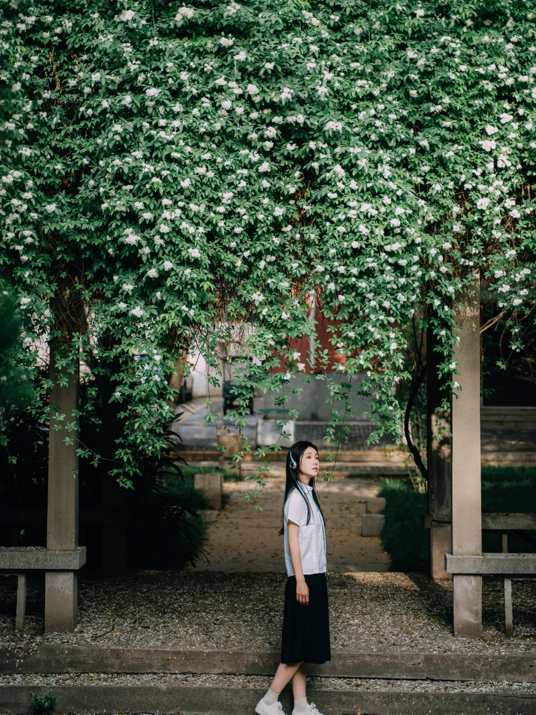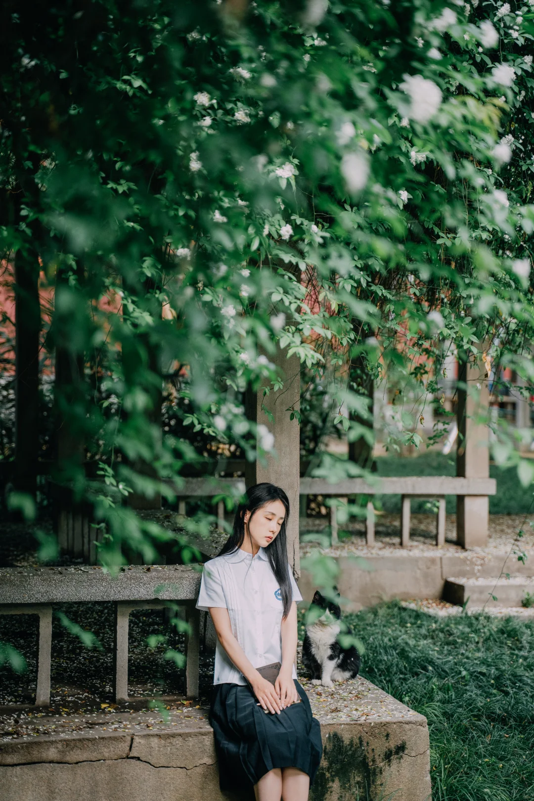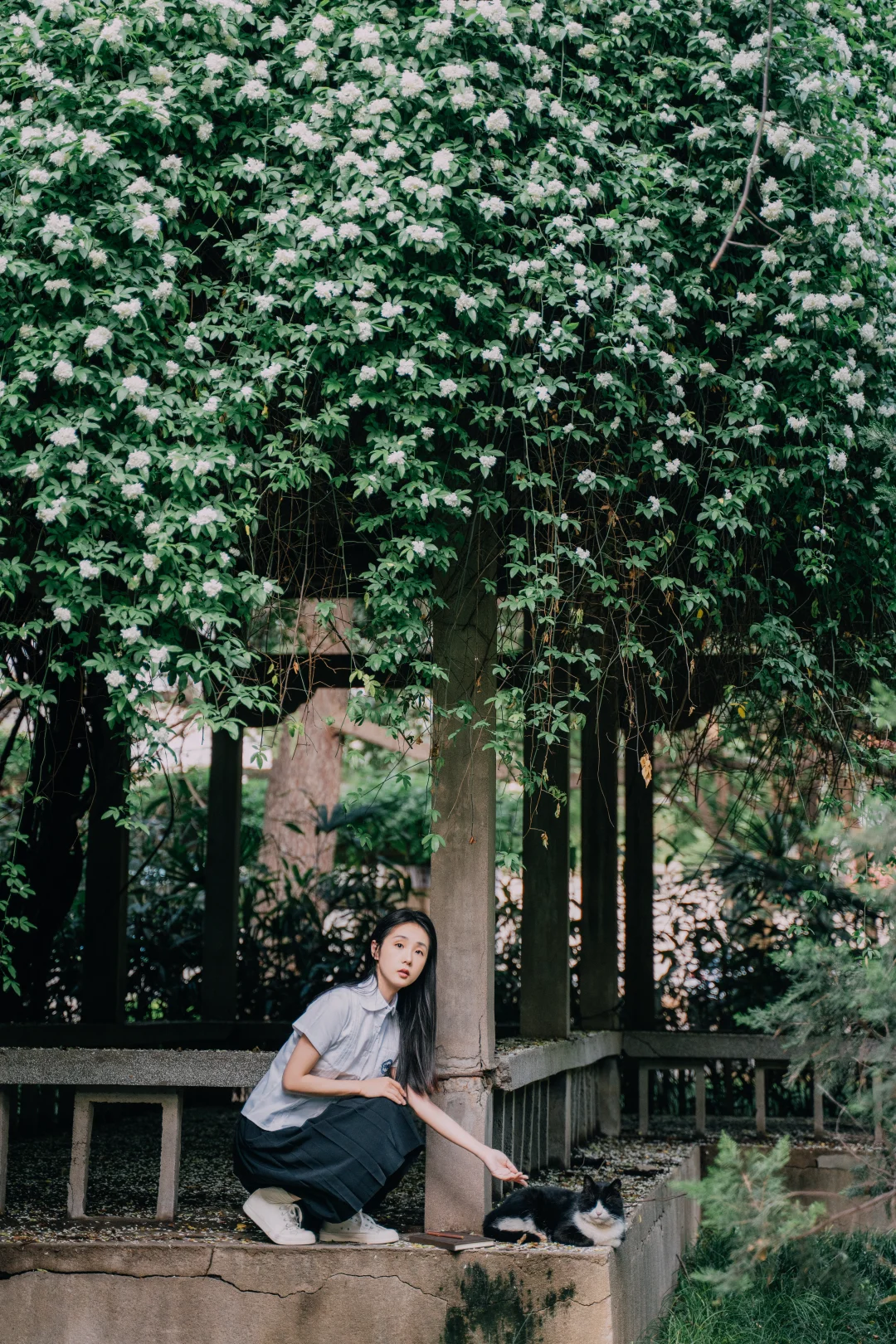 西北大学太白校区, 木香花进入盛花期。 拍照时🐱猫咪很配合地出镜。 长廊下听歌、书写✍️ 仿佛回到了初中听周杰伦的年纪。 简单爱、七里香、园游会, 爱情干净得像白色校服。 突然觉得这组很像毕业照。 这几日去师大雁塔校区拍照, 看到那些年轻的身影, 如之对我说:我好羡慕他们。 时光推着人向前, 诗句结尾的“永远爱你”能走到永远吗? 至少能走到从校门走出的那一刹那吧。 木香花 交换春天 西安赏花