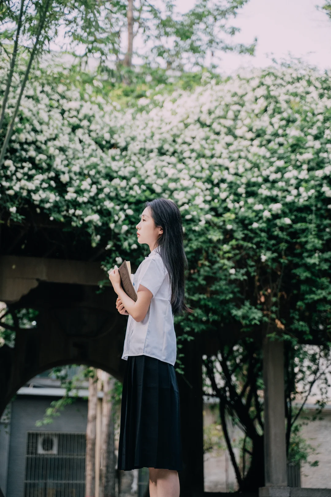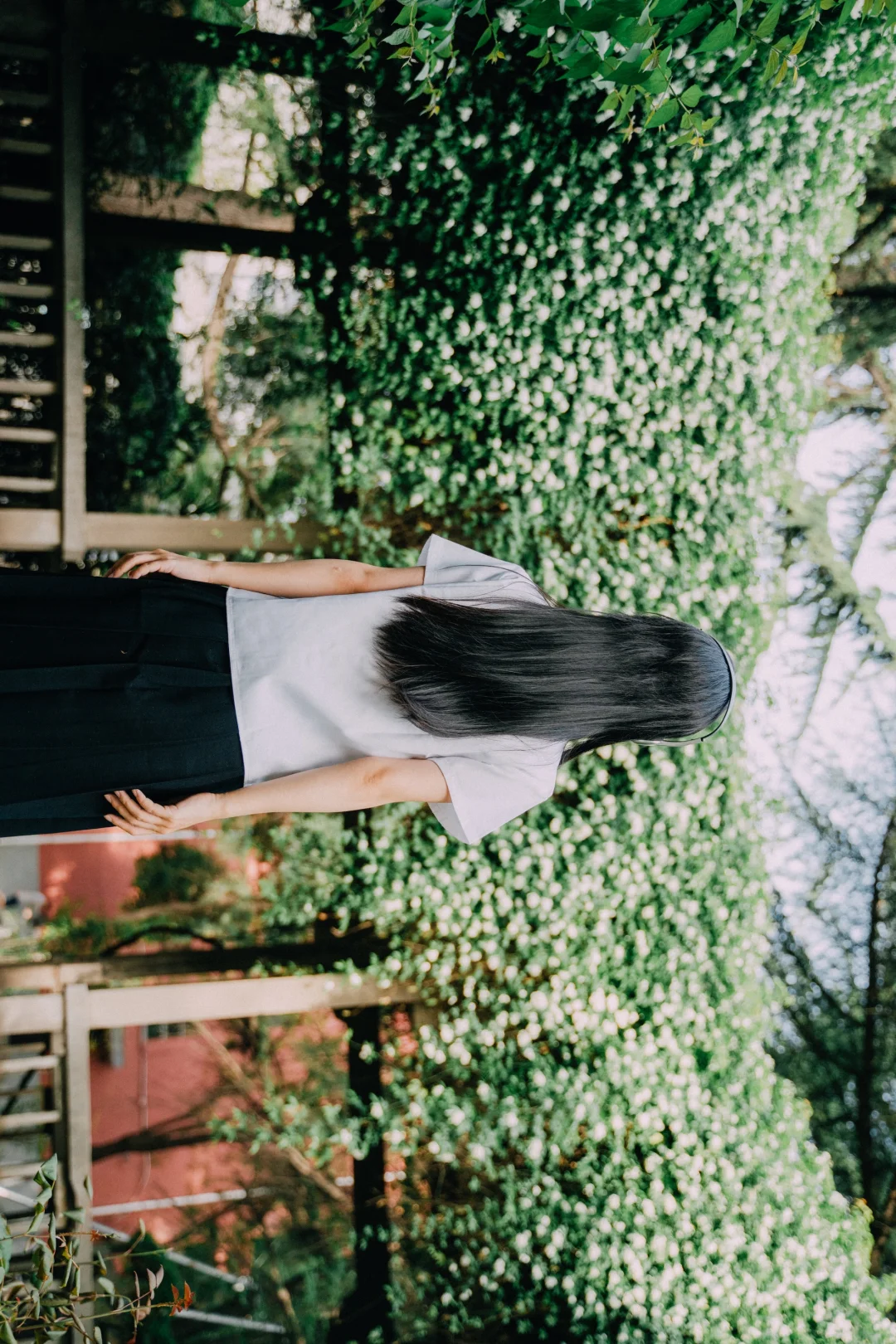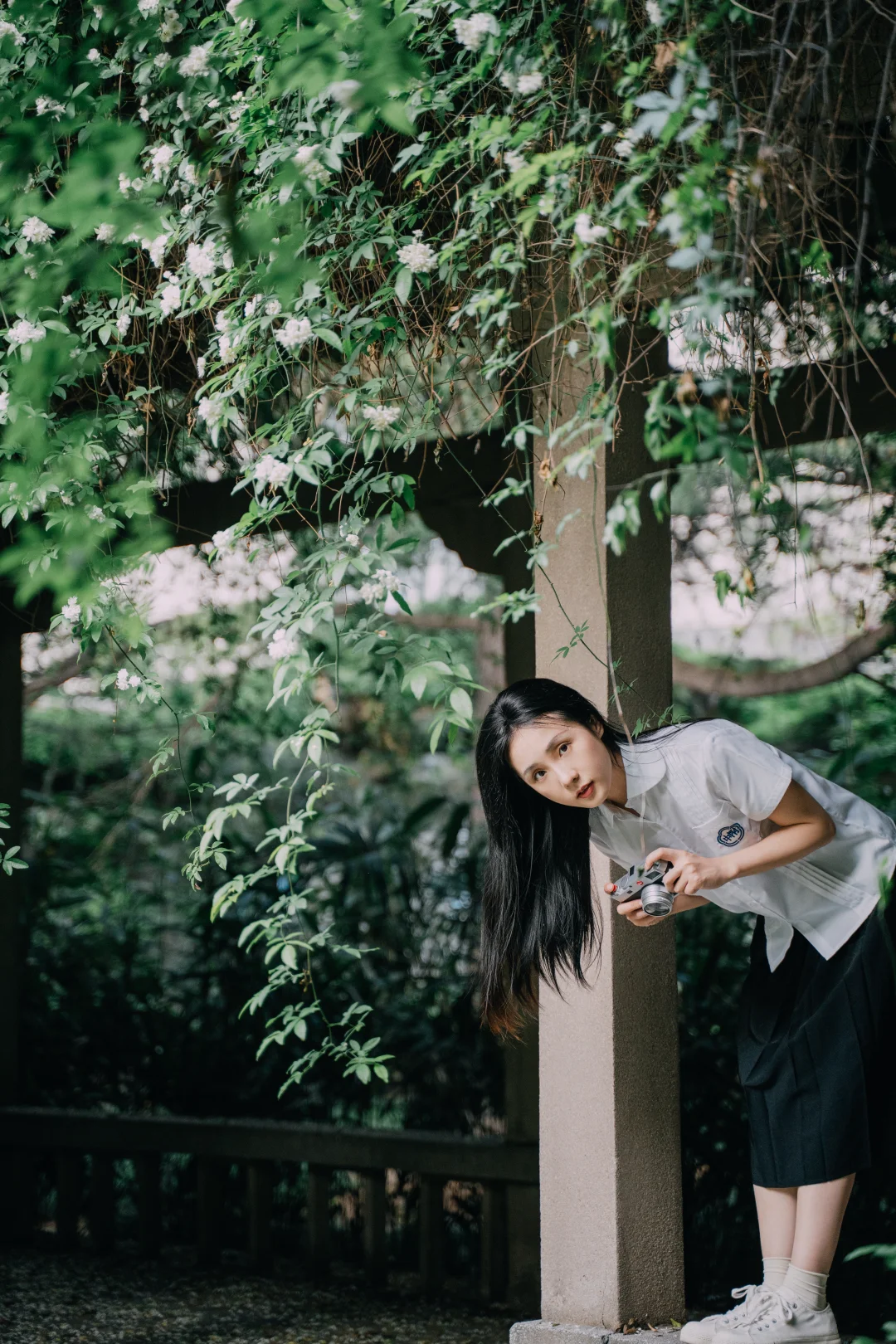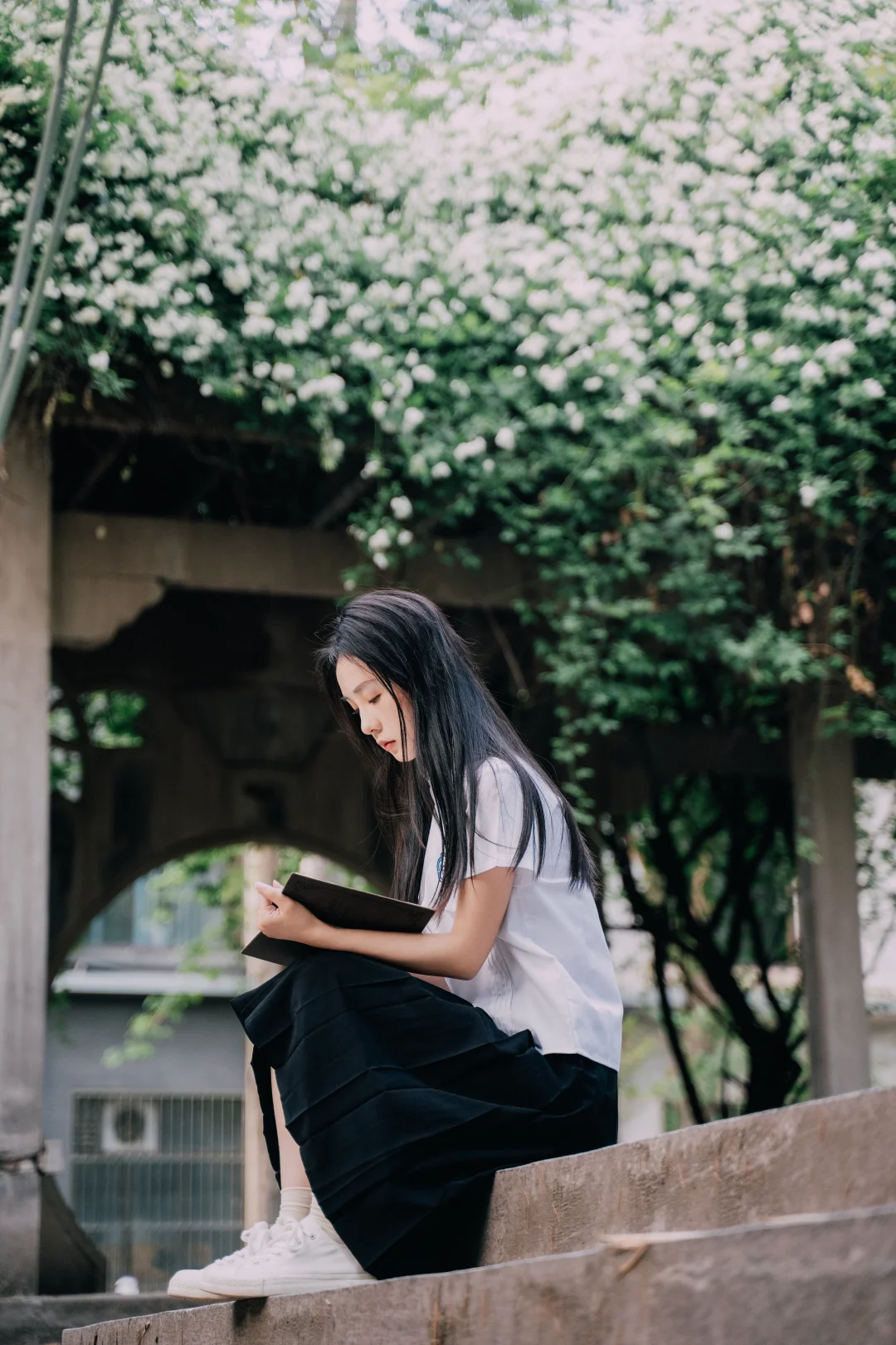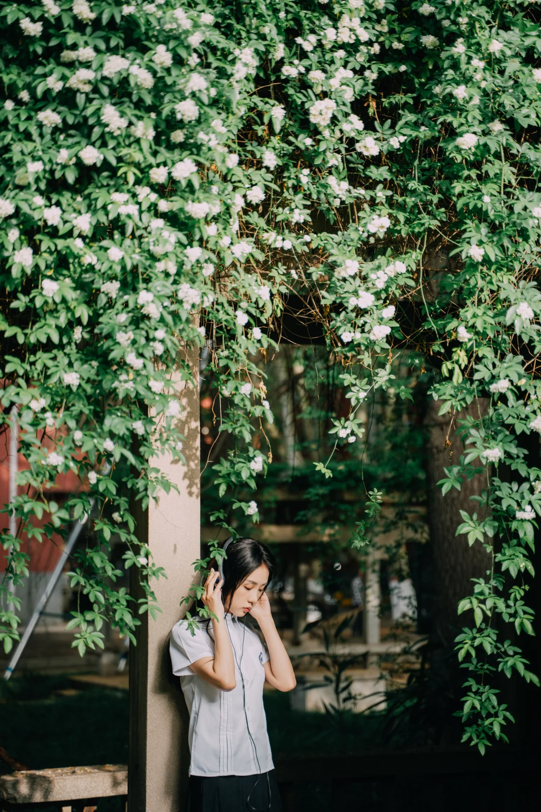 西北大学太白校区, 木香花进入盛花期。 拍照时🐱猫咪很配合地出镜。 长廊下听歌、书写✍️ 仿佛回到了初中听周杰伦的年纪。 简单爱、七里香、园游会, 爱情干净得像白色校服。 突然觉得这组很像毕业照。 这几日去师大雁塔校区拍照, 看到那些年轻的身影, 如之对我说:我好羡慕他们。 时光推着人向前, 诗句结尾的“永远爱你”能走到永远吗? 至少能走到从校门走出的那一刹那吧。 木香花 交换春天 西安赏花