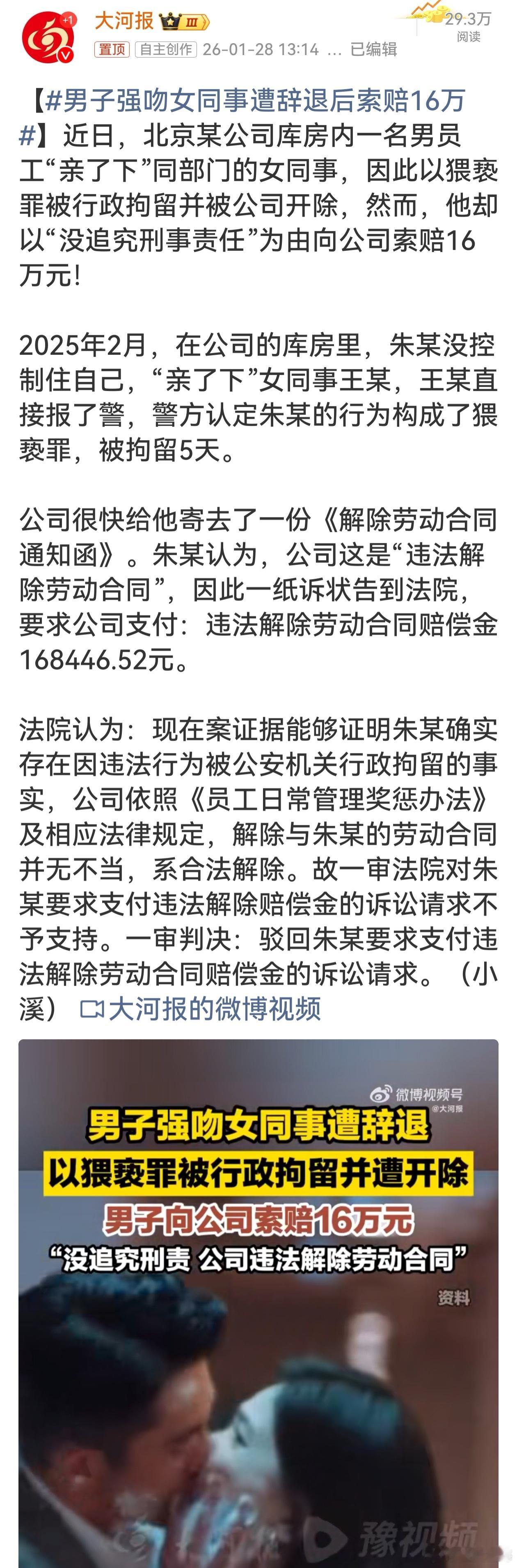 男子强吻女同事遭辞退后索赔16万男子强吻女同事,触碰道德与法律红线,被公司开除合理合法。其以未追究刑责索赔 16 万,是妄图无理取闹。法院公正判决驳回诉求,彰显了对违法失德行为的零容忍,警示职场人要恪守行为准则,尊重他人权益。