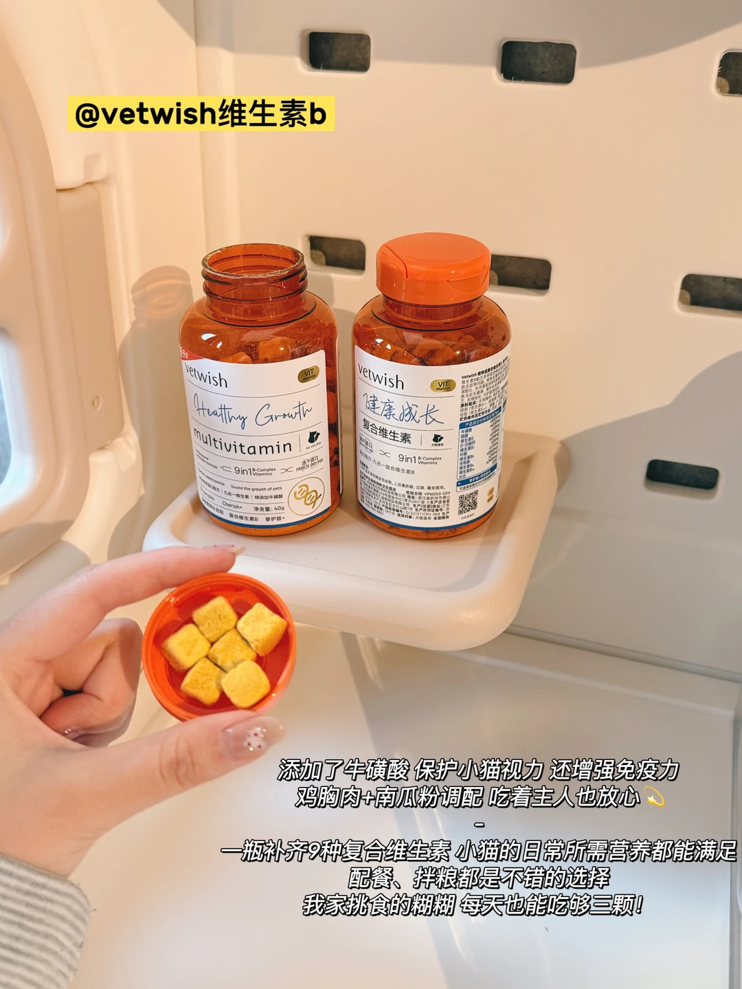 🍽️营养区:专门腾了个小台子放糊糊的补剂!vetwish复合维生素B是我家近期一直在喂的~酥酥脆脆的冻干小方块形状哦!精准控量喂食不浪费,帮助猫咪养出柔顺毛毛~之前只注重颜值,猫屋再好看,营养跟不上也白搭!