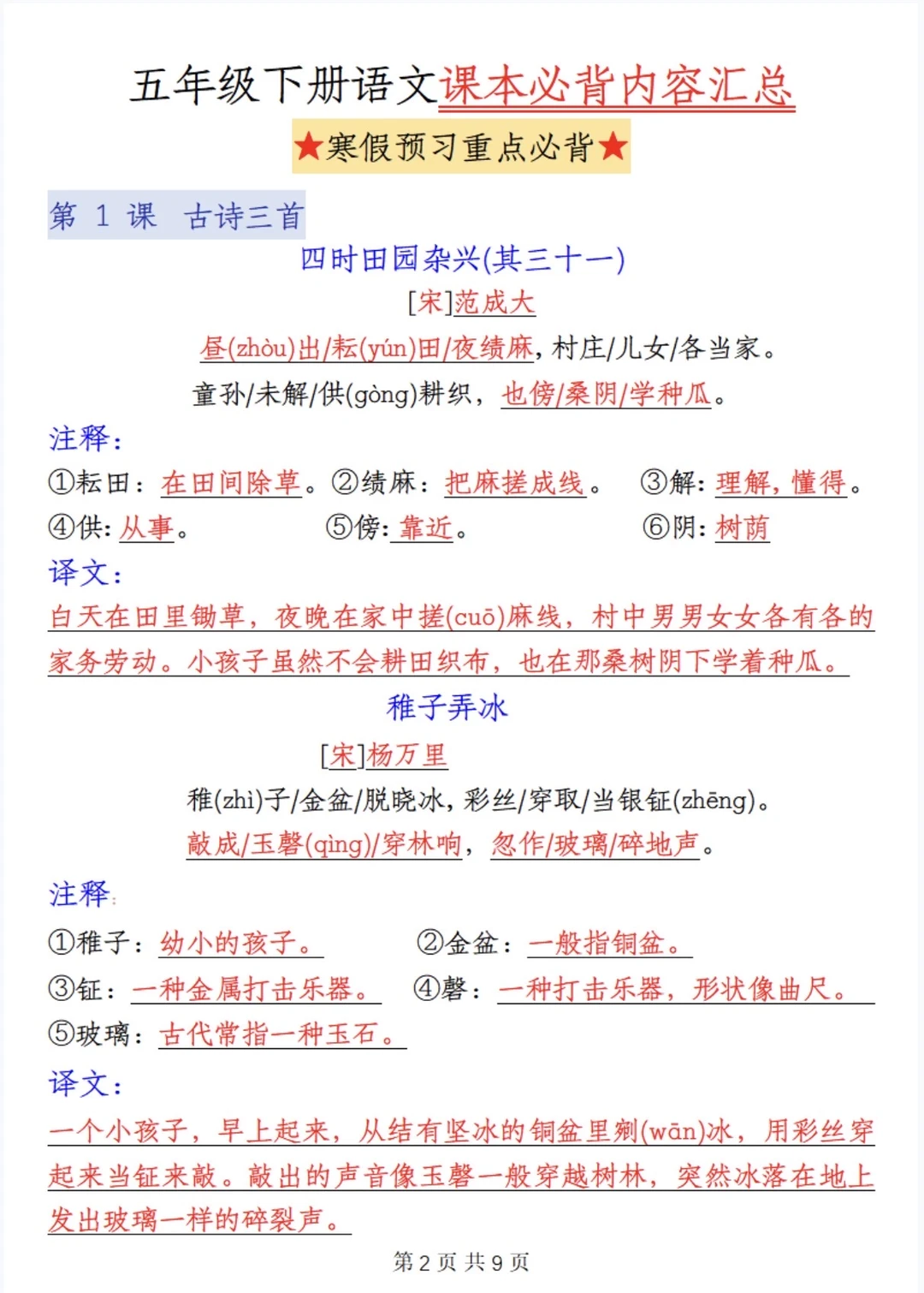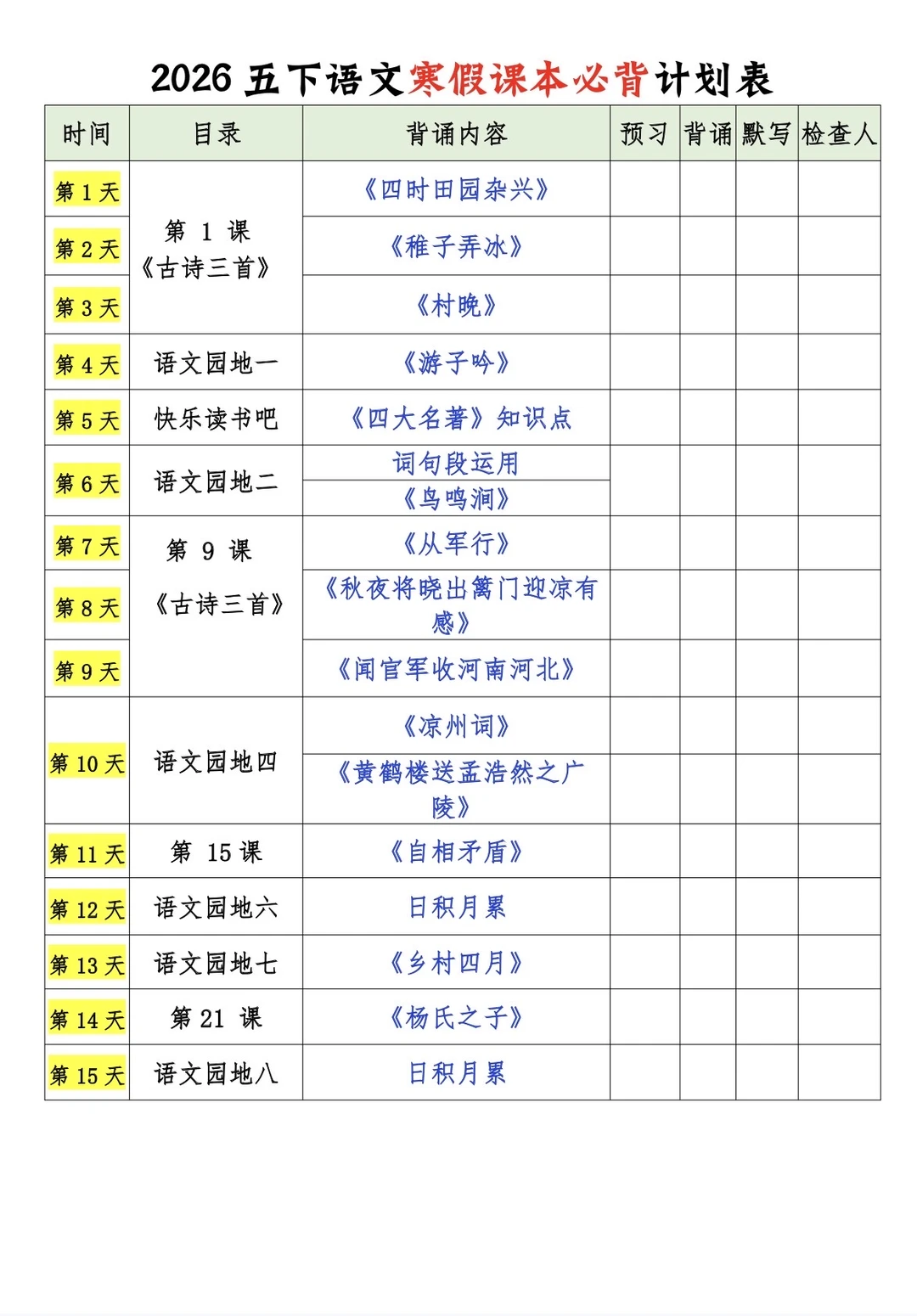 寒假五年级下册课文必背内容默写单➕打卡表来啦! 鸭妮老师精心制定了假期科学安排15天打卡计划 每天给娃安排一个小任务📝 先理解,再背诵,最后默写~在开学之前先把基础知识过一遍,开学了才能更游刃有余,将更多精力花在阅读和写作上! (👇左下角附有《四大名著》重要考点梳理,大家可自行下载哟!)
